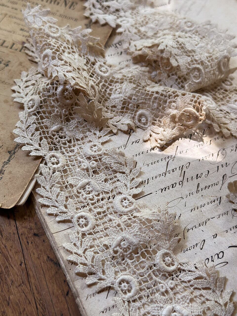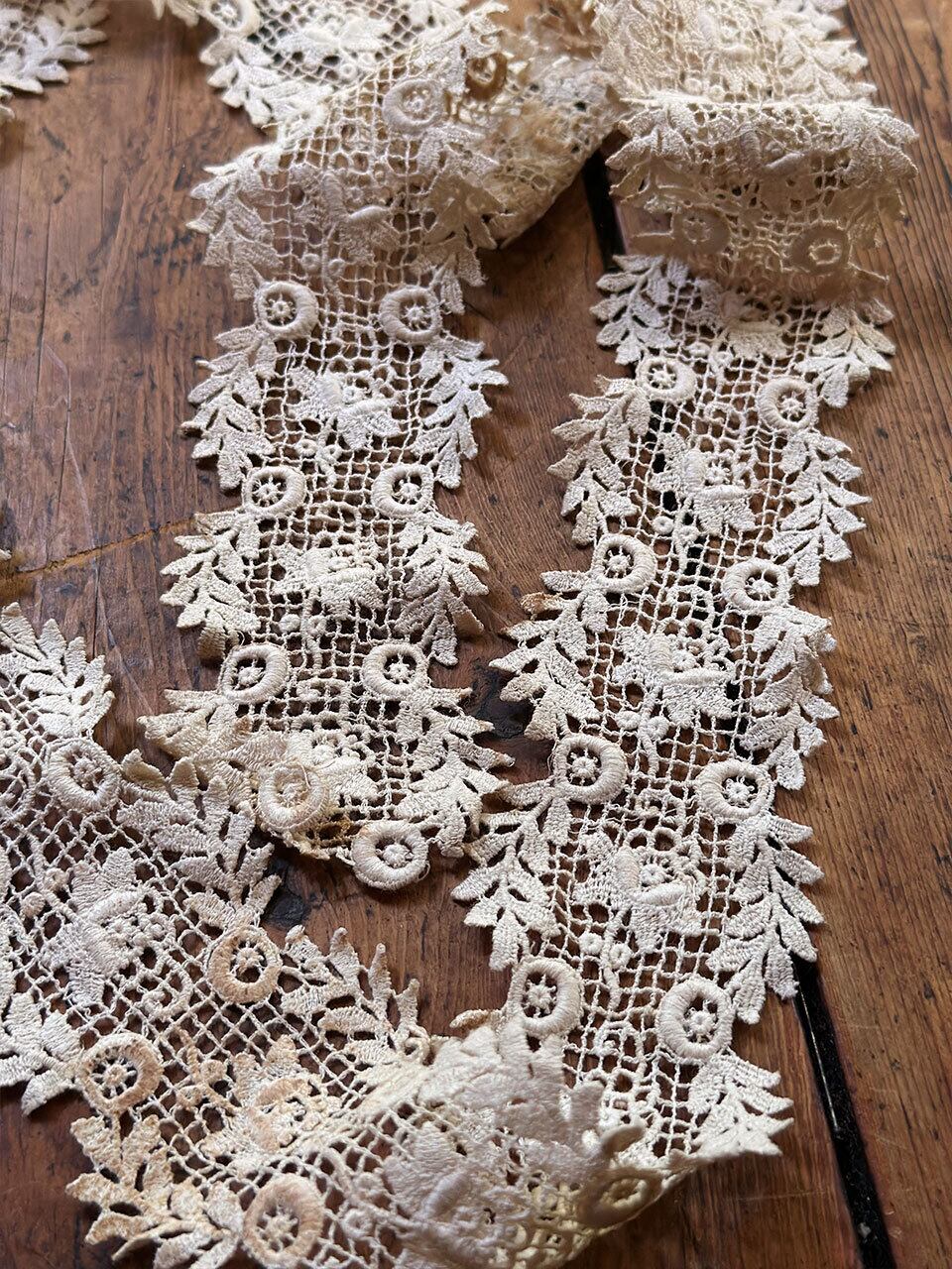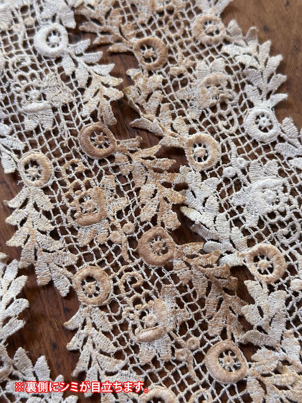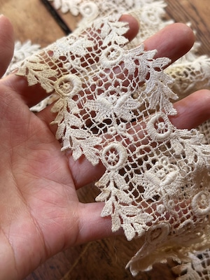 シンプルなリネンやコットンのファブリックに縁飾りとして縫い付ければ、日常使いのアイテムが瞬く間にリュクスなアンティーク仕様に。ウェディングアイテム装飾の一部として用いるのも素敵です。また、何かのパーツとして切り取る際も、この長さがあれば躊躇なくお使いいただけます。