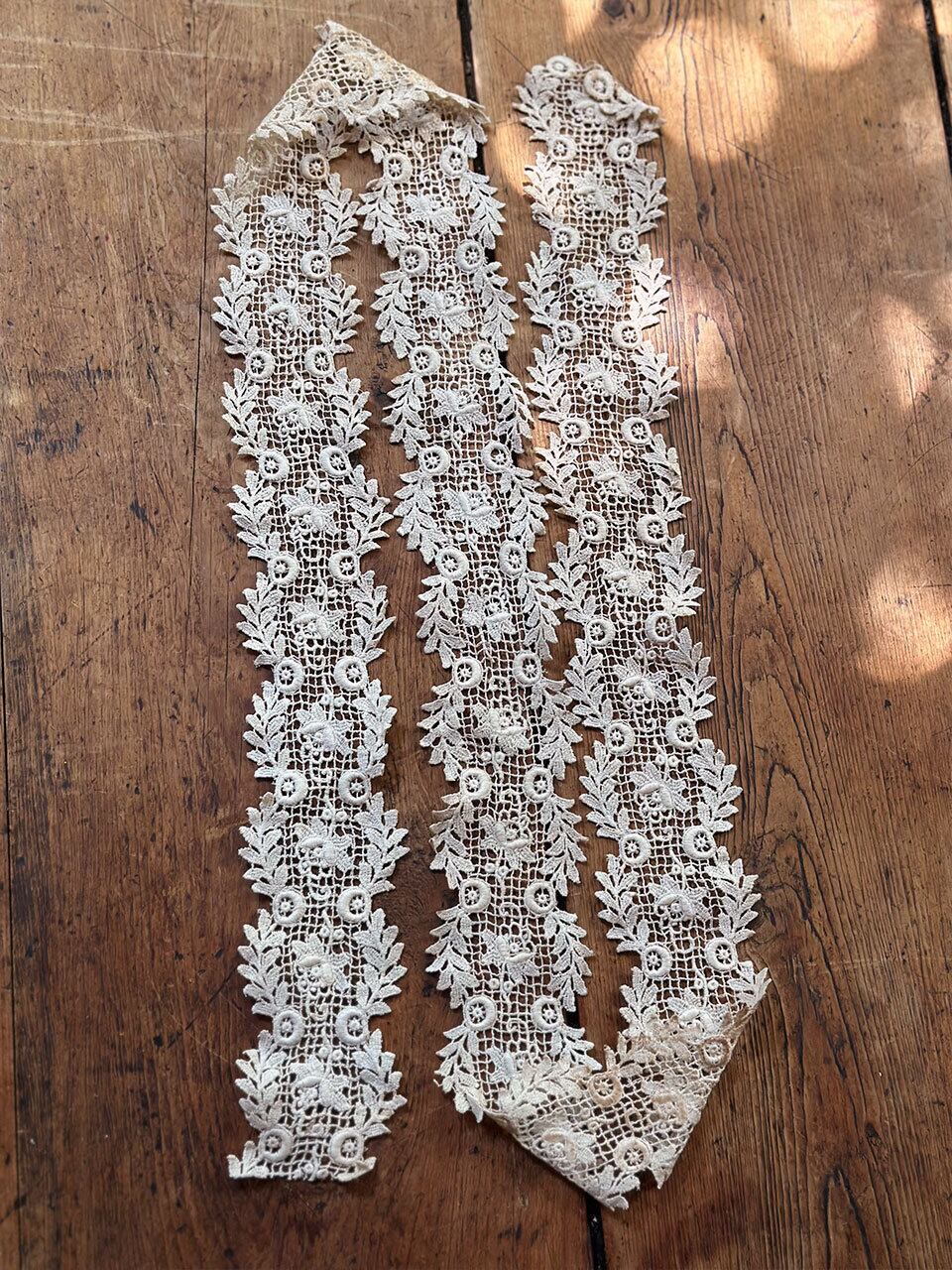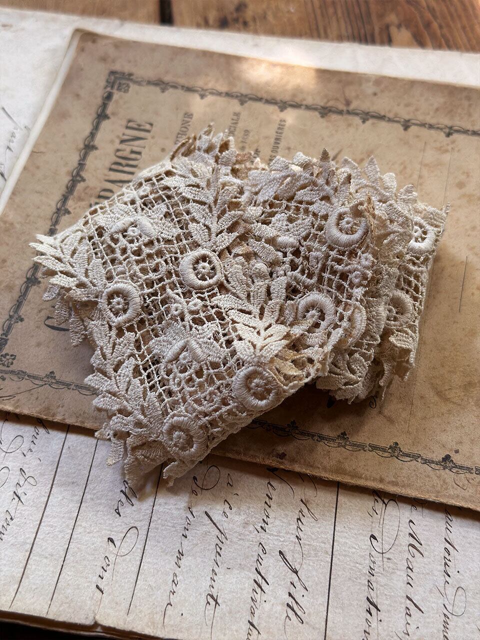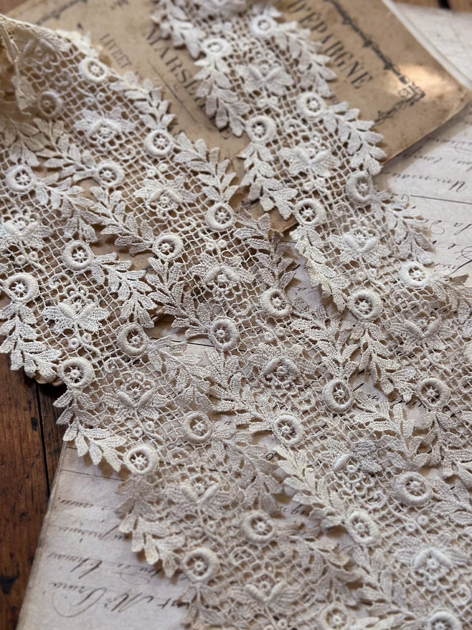 シンプルなリネンやコットンのファブリックに縁飾りとして縫い付ければ、日常使いのアイテムが瞬く間にリュクスなアンティーク仕様に。ウェディングアイテム装飾の一部として用いるのも素敵です。また、何かのパーツとして切り取る際も、この長さがあれば躊躇なくお使いいただけます。