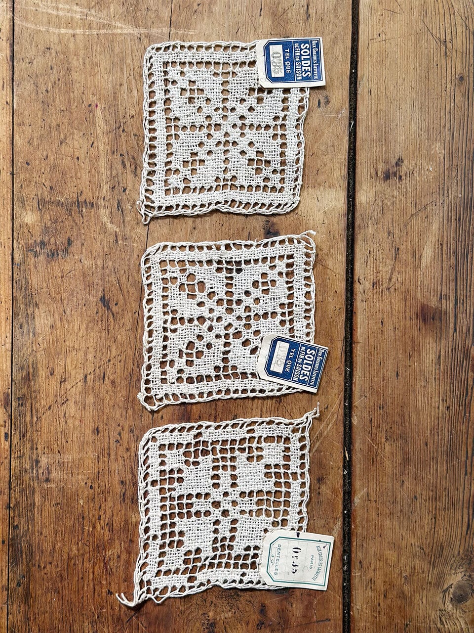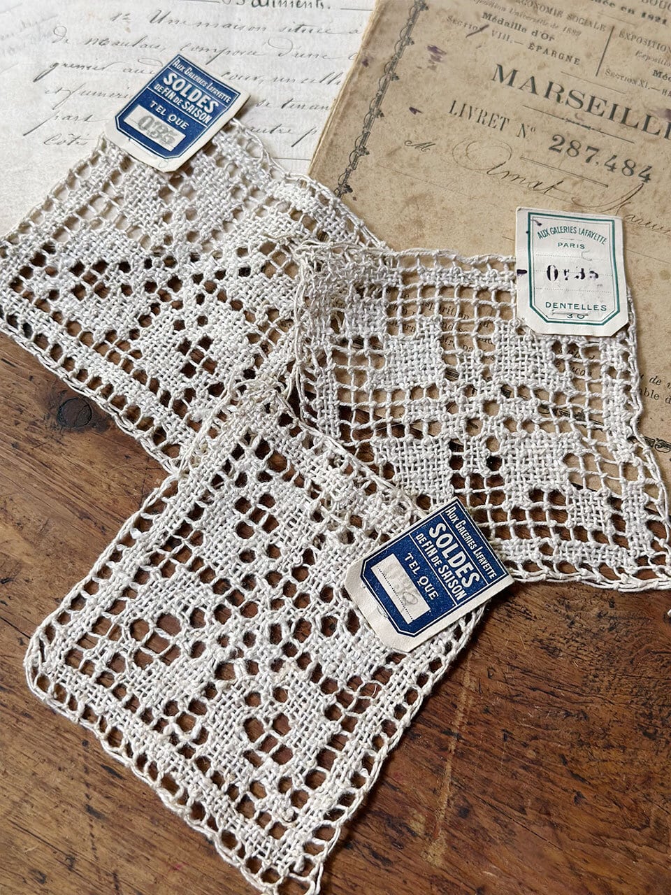 このセットの何よりの魅力は、それぞれのレースに大切に残された古い紙のタグです。パリの有名な百貨店「ギャラリー・ラファイエット」の名が記されたタグには、「SOLDES(セール)」の文字や手書きの数字が鮮やかに残されています。それは、このレースが百貨店のショーケースに並び、誰かの手に渡り、大切にされてきた記憶の証。当時の人々の暮らしや、フランスの賑やかな街並みに思いを馳せてみるのも良いですね。