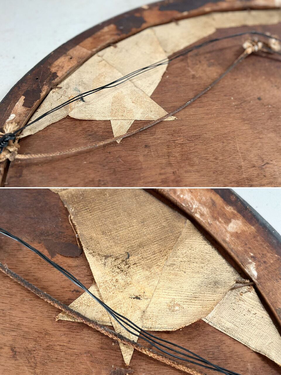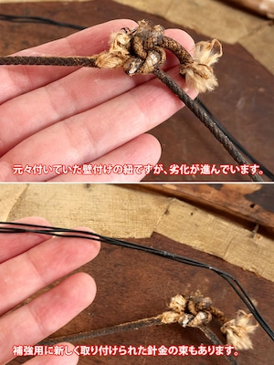 ※壁付け用の引っ掛け紐ですが、元々付いていたと思われる紐は劣化が進んでいます。補強用に針金が新しく取り付けられているので、壁付けの際は両方をお使いいただくと安心かと思います。