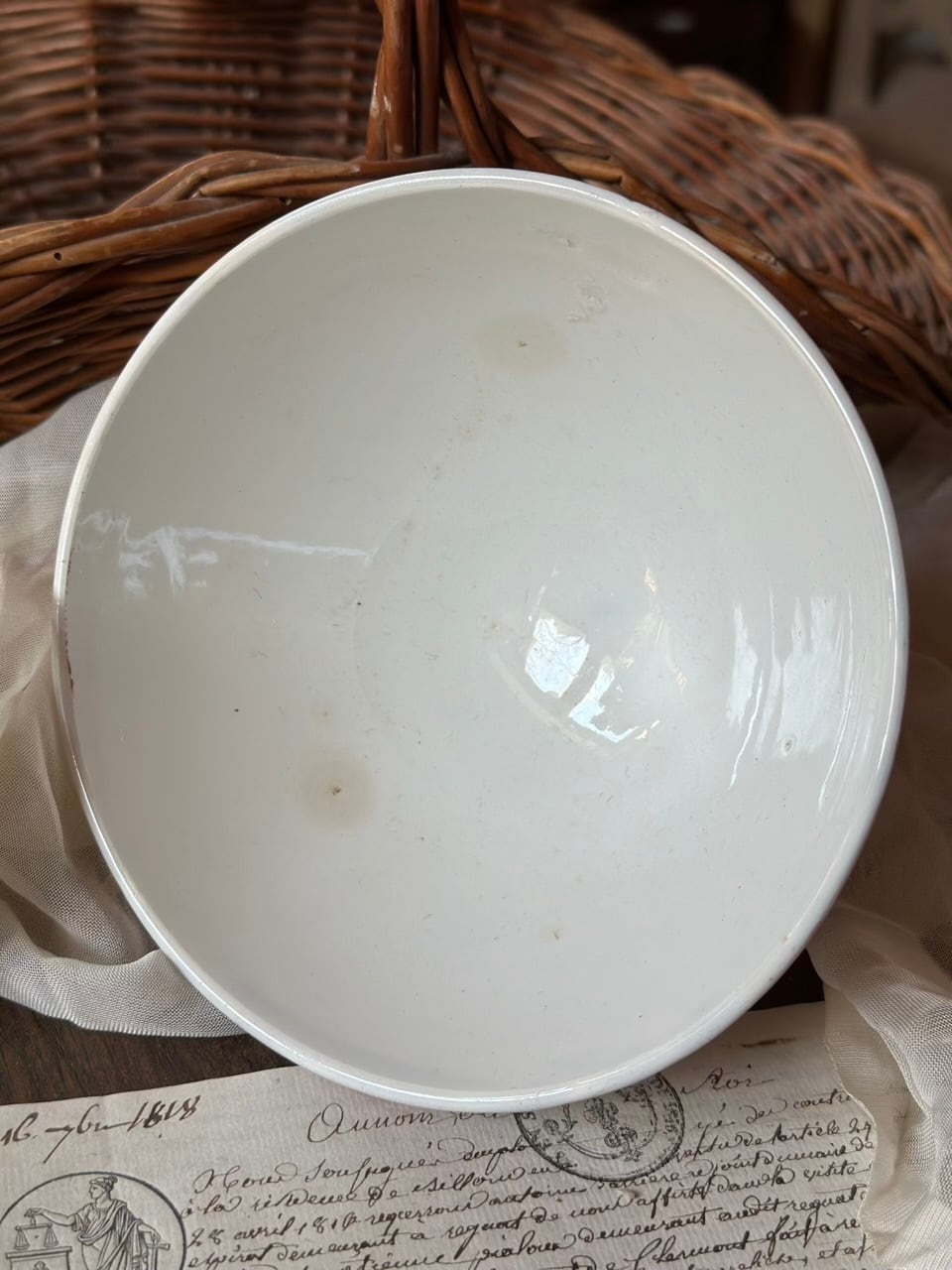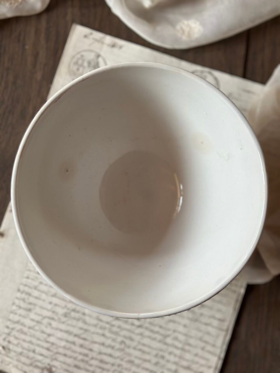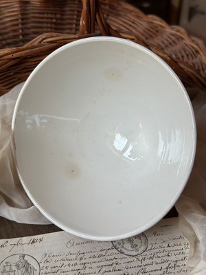 高台(脚)が付いた姿は大変美しく、手に取るとフランスの豊かな暮らしの情景が目に浮かぶようです。100年以上の時を超えてきた釉薬の艶や、底に刻まれた古びた番号「75」も、このボウルが歩んできた長い歴史を静かに物語っています。