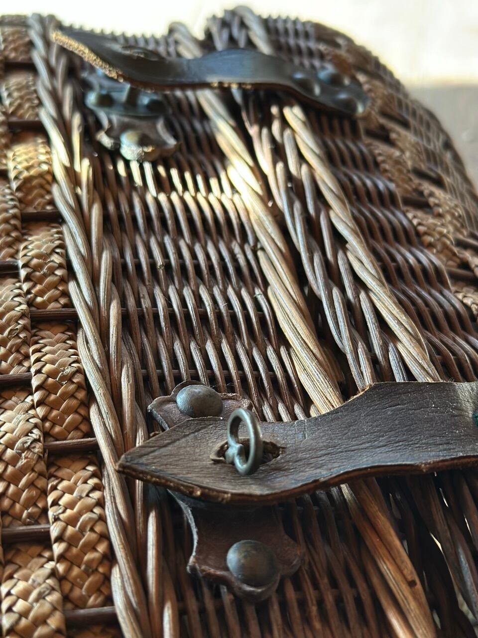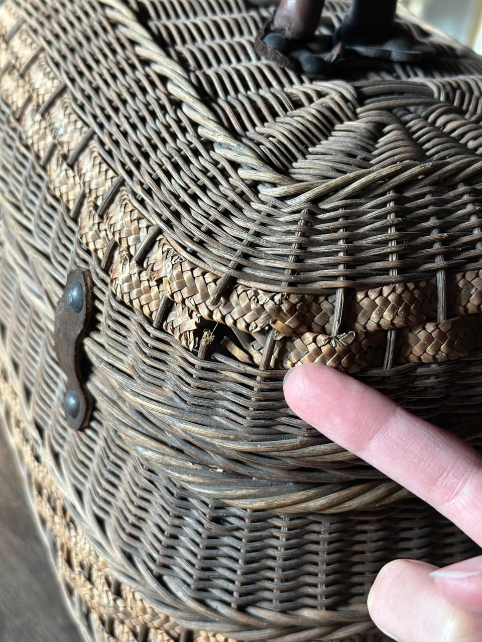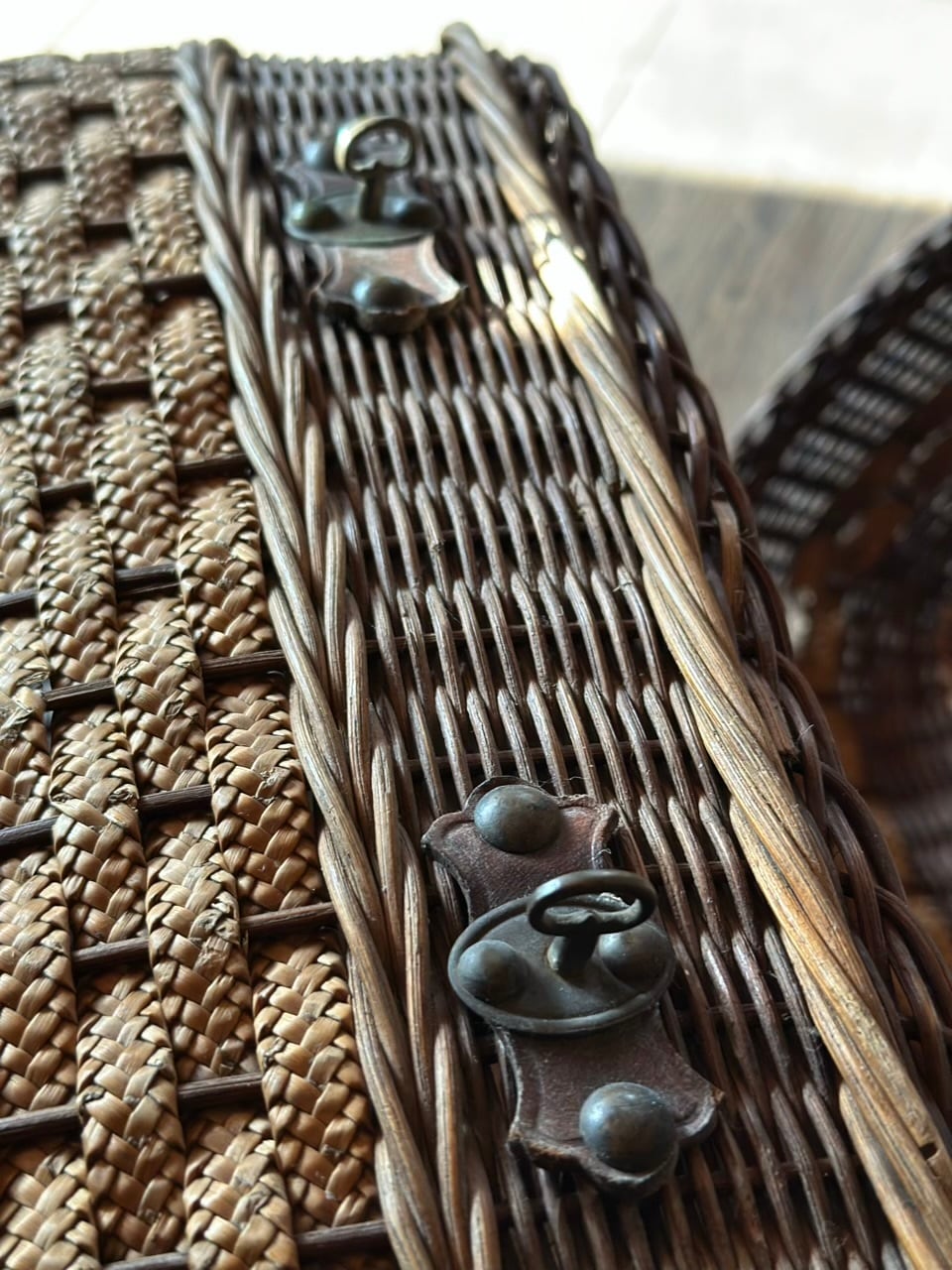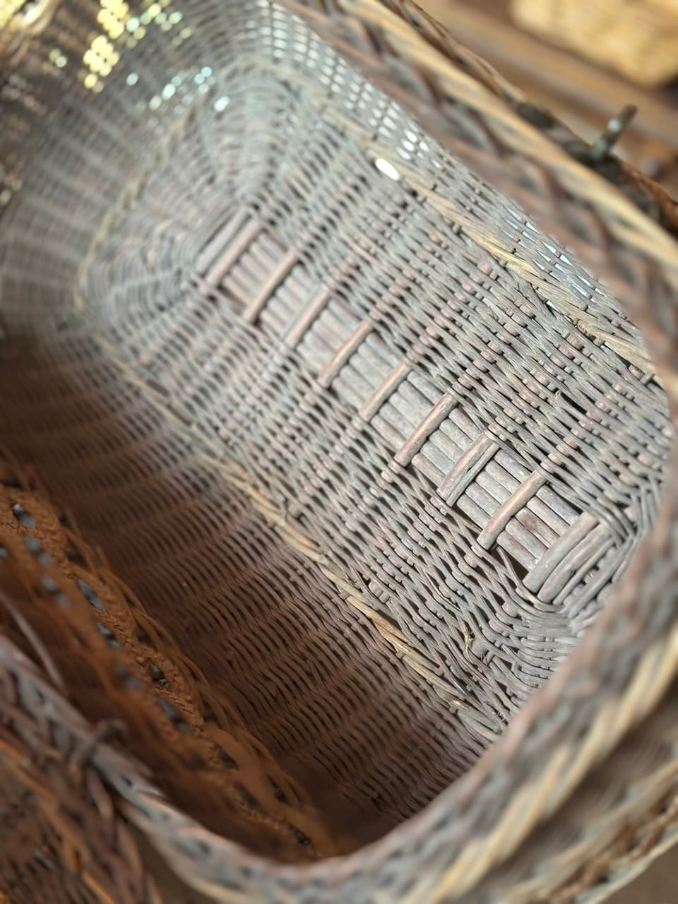 太めの蔓でしっかりと組まれた骨格に、繊細な飾り編みがアクセントとして施され、当時の職人の手仕事の細やかさが伝わってきます。