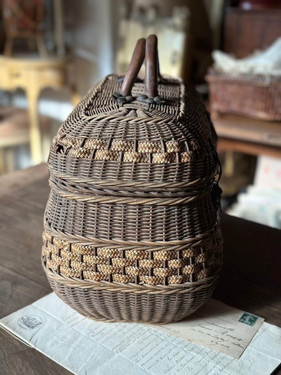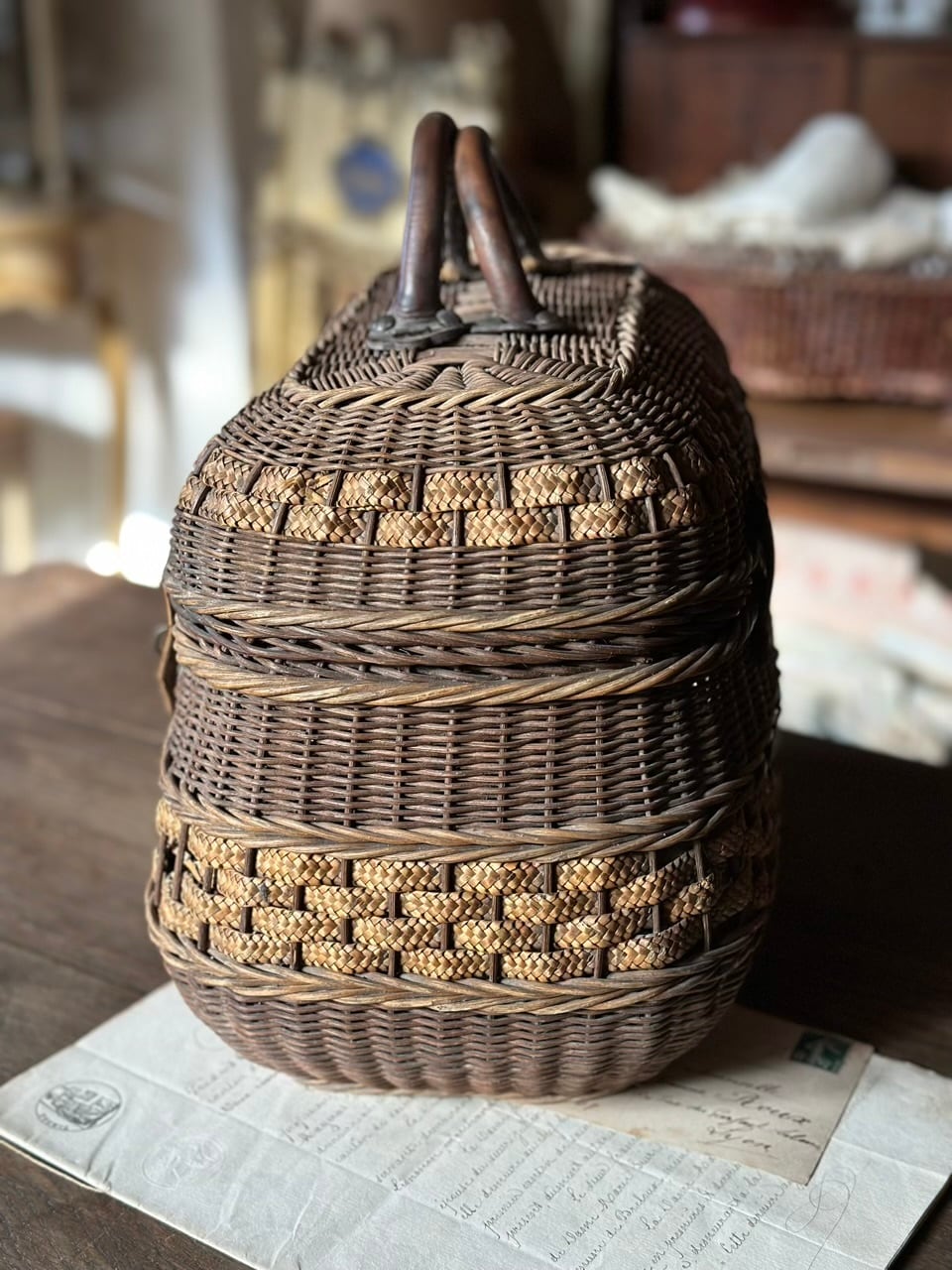 フランスアンティーク 茶色のパニエ 編み込み