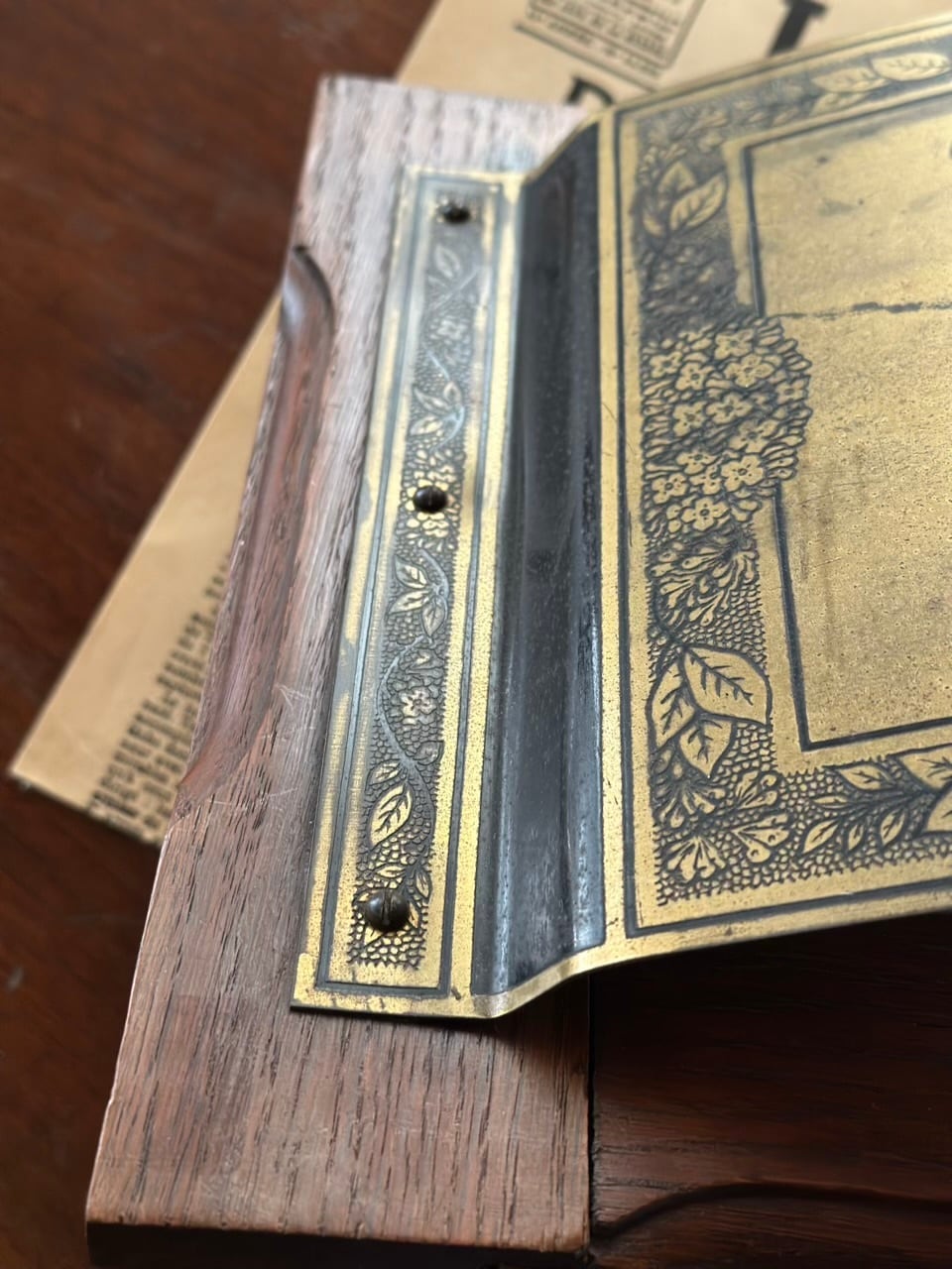アール・ヌーヴォー期を彷彿とさせる、繊細な植物模様のレリーフが施された真鍮プレートが印象的です。