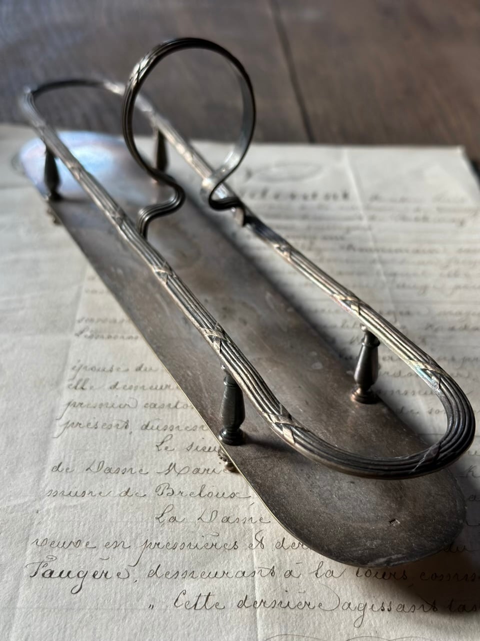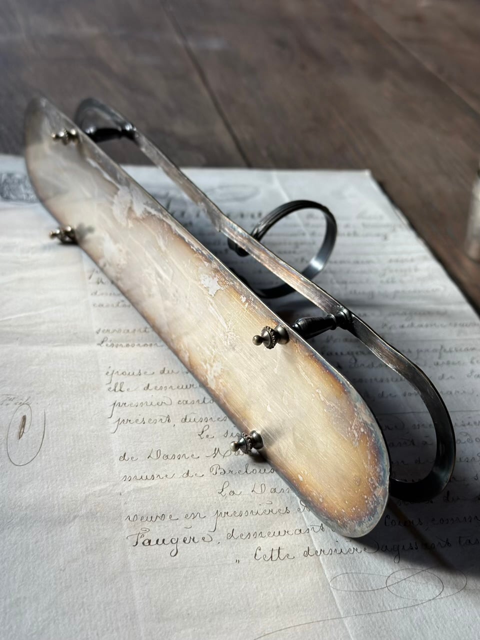 素材はフランスアンティーク特有のシルバープレート。長い年月を経て少しマットになった質感や、ところどころに見られる変色や歪みが、新品には出せない深みのある陰影を作り出しています。