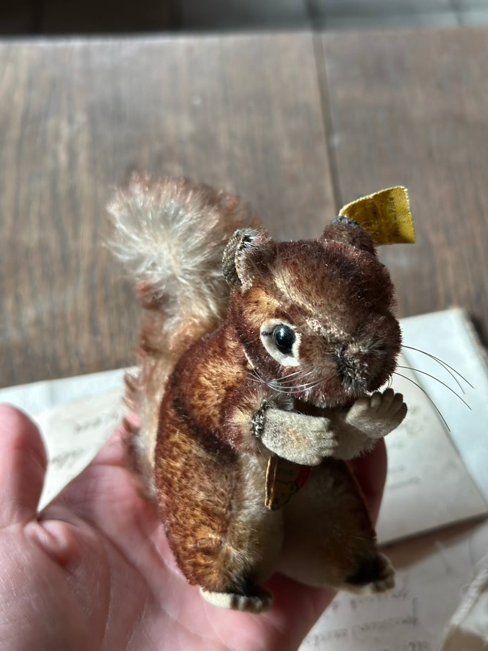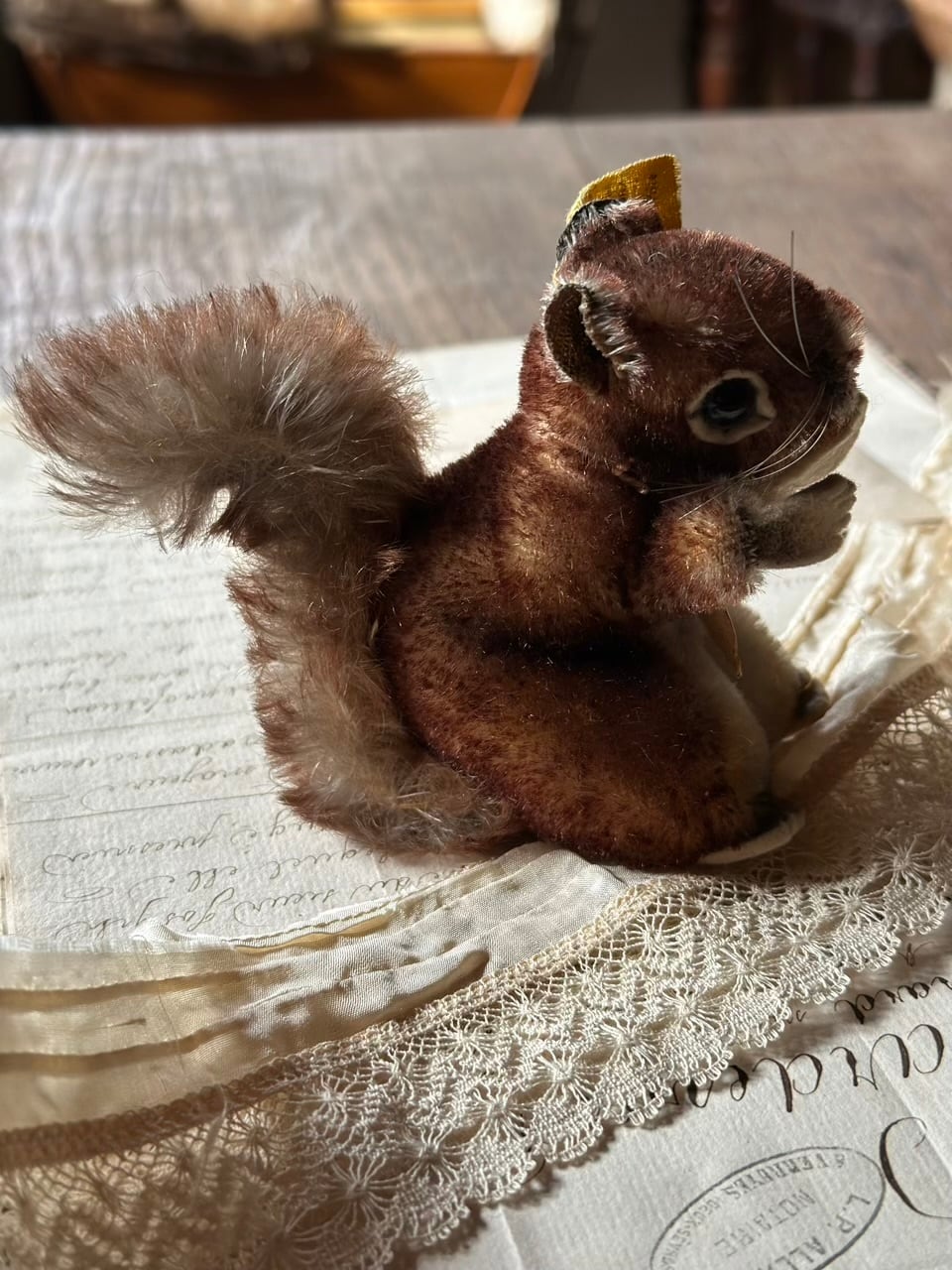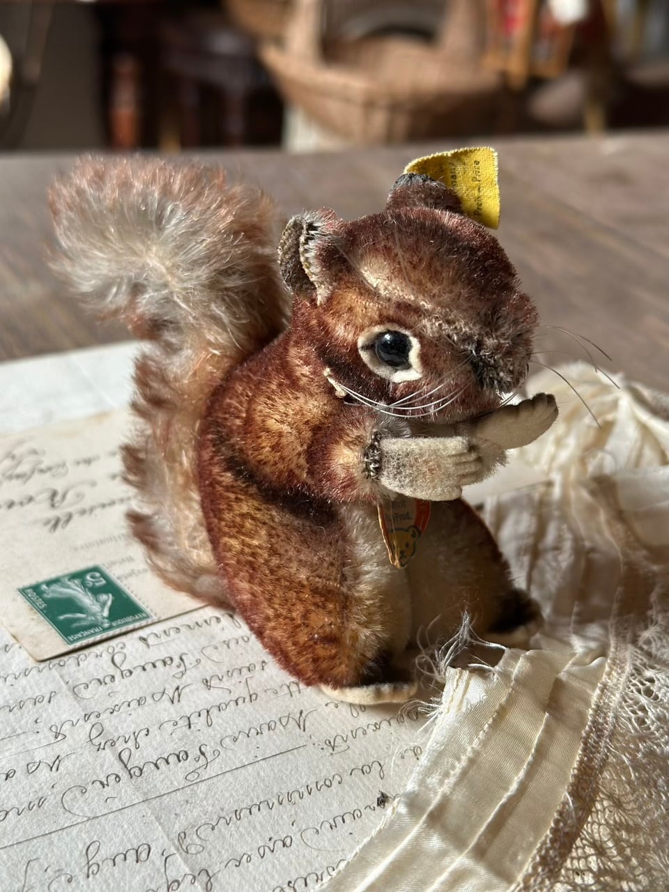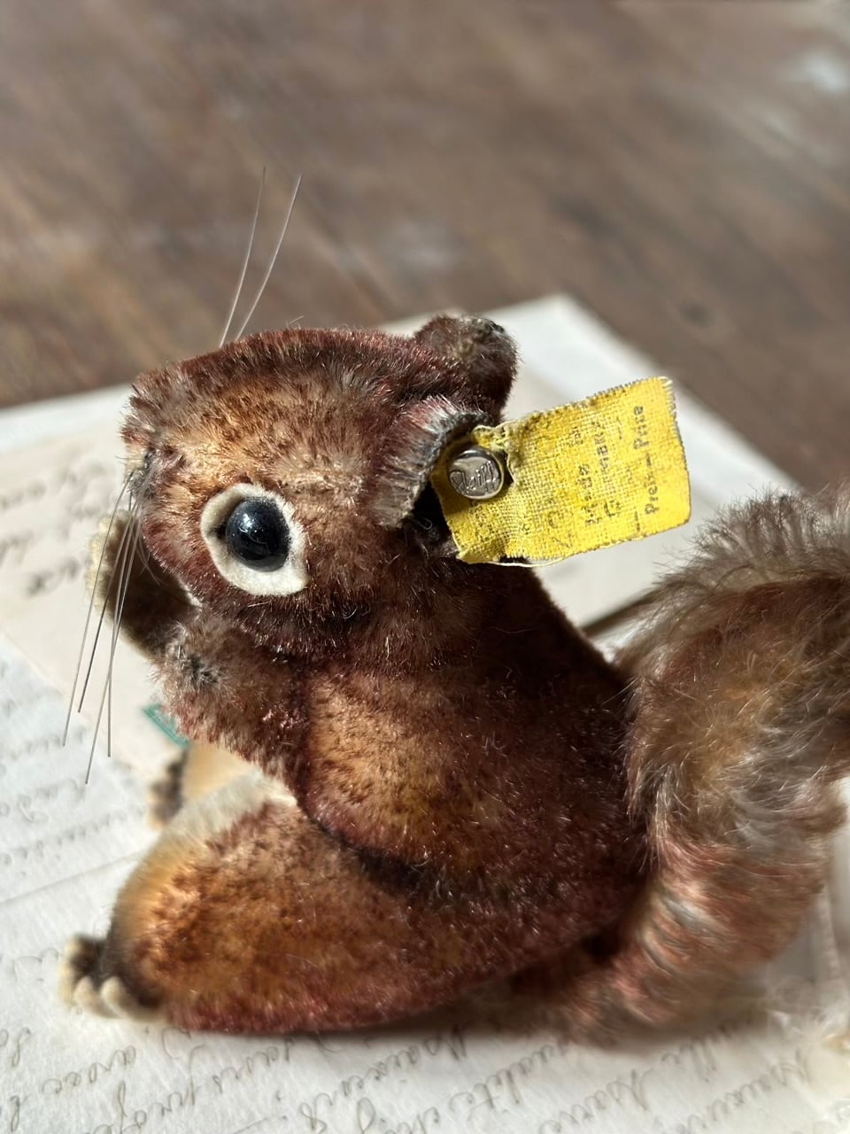モヘアの豊かな毛並みは時を経て、より深みのあるブラウンのグラデーションとなり、愛くるしいポーズと相まって、静かに語りかけてくるような情緒的な佇まいです。黒いグラスアイ(ガラスの瞳)とピンと伸びた長いひげが、本物のリスのような生命感を宿しています。