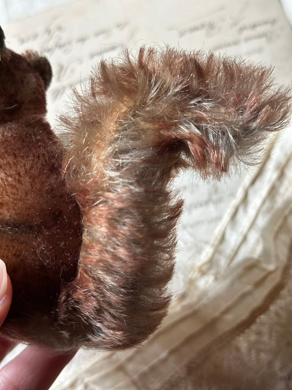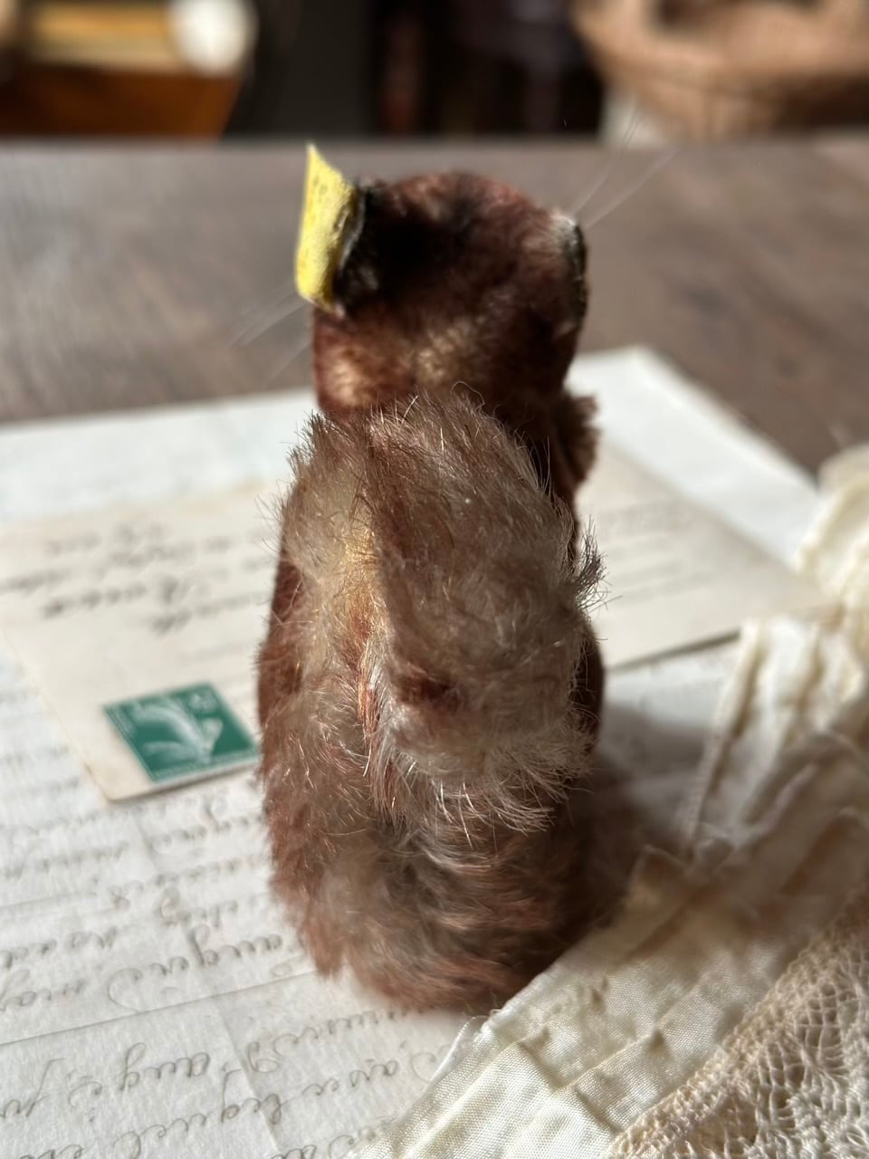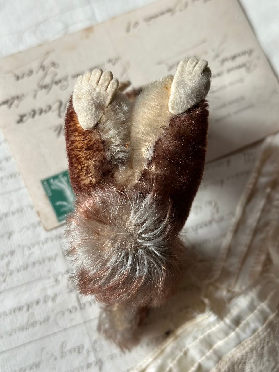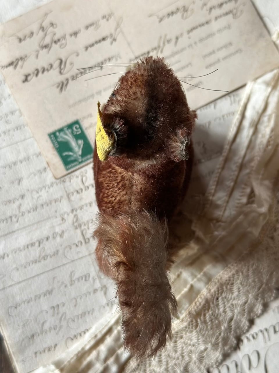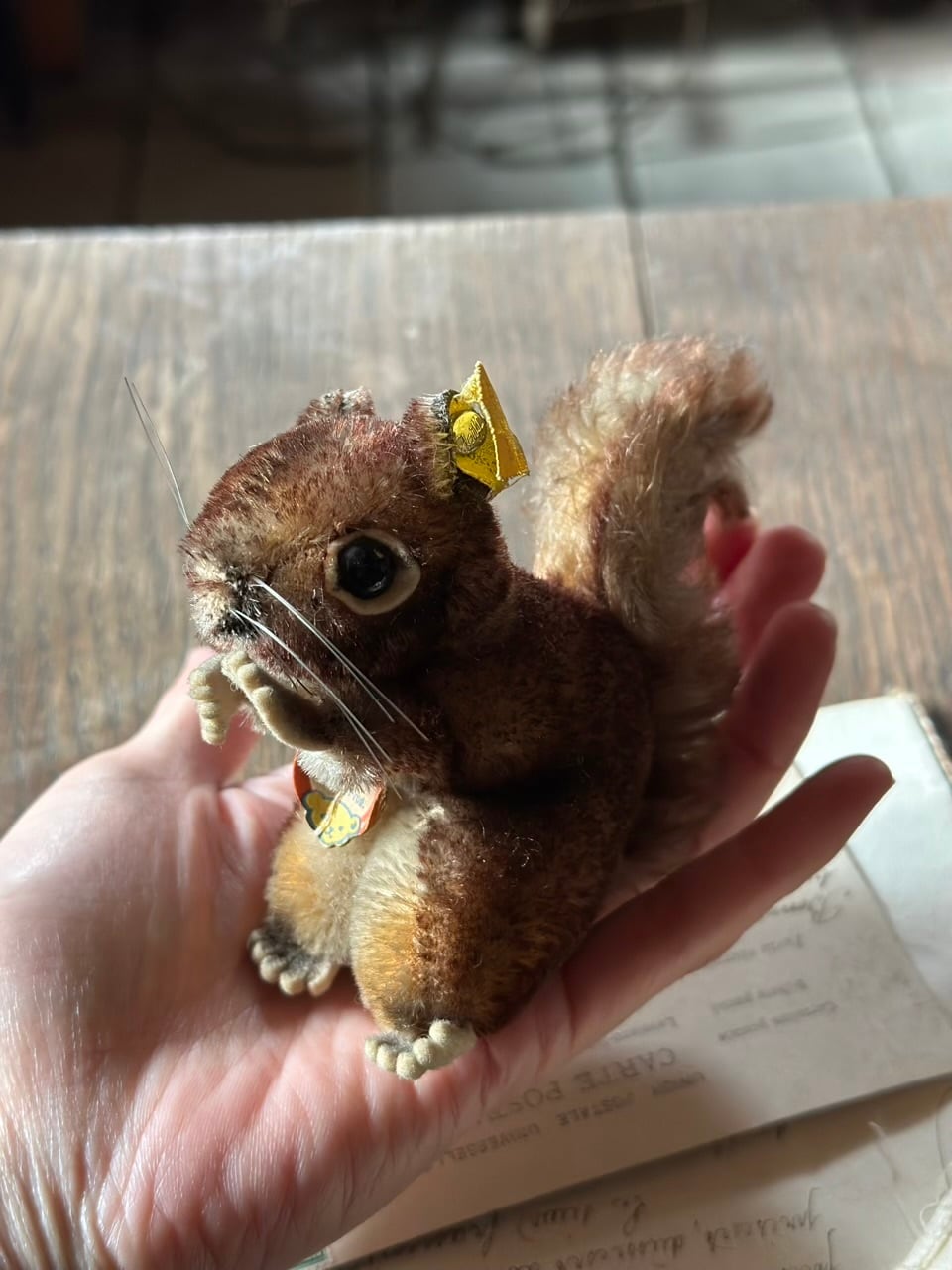 モヘアの豊かな毛並みは時を経て、より深みのあるブラウンのグラデーションとなり、愛くるしいポーズと相まって、静かに語りかけてくるような情緒的な佇まいです。黒いグラスアイ(ガラスの瞳)とピンと伸びた長いひげが、本物のリスのような生命感を宿しています。