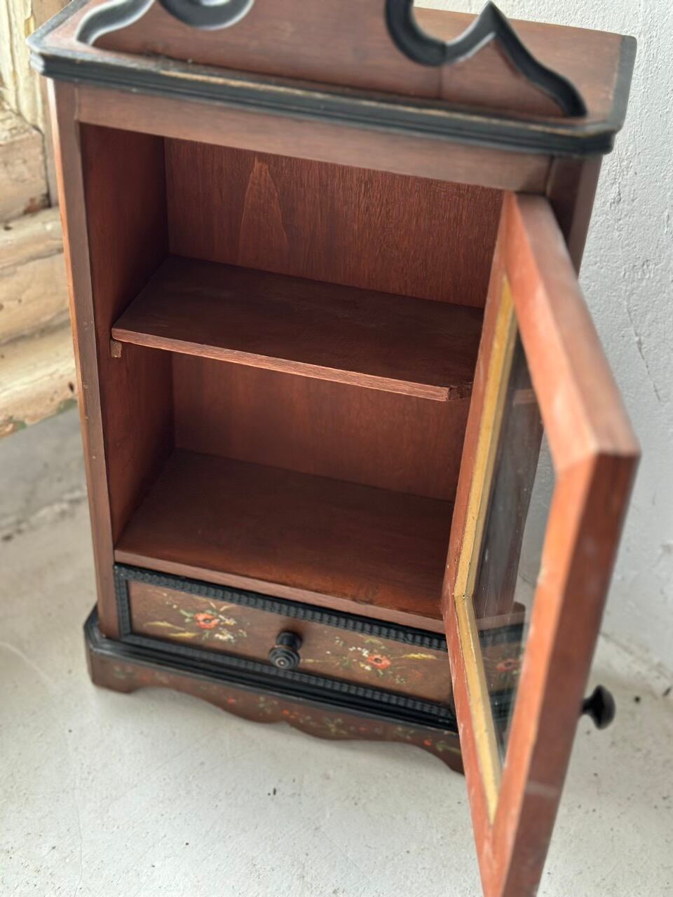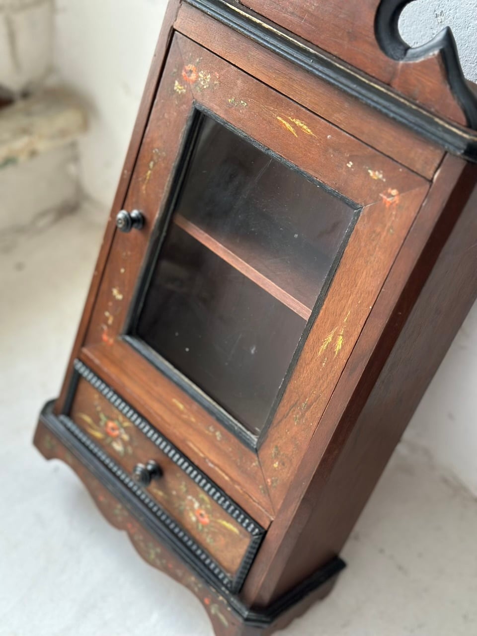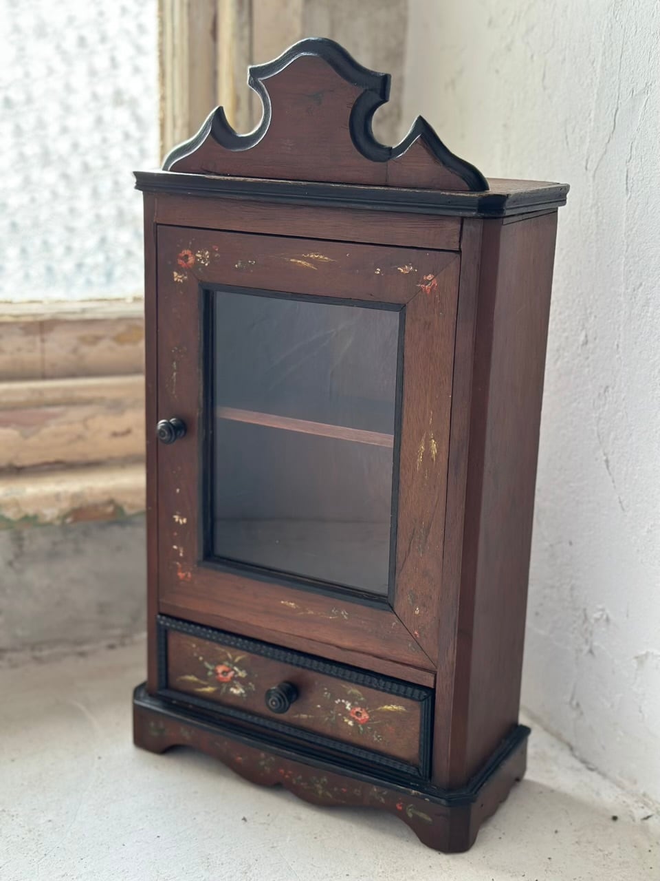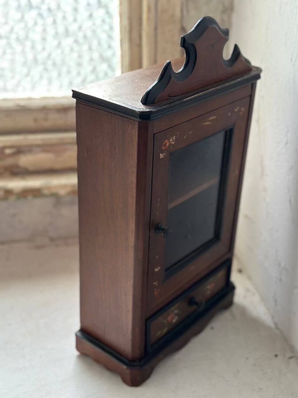 上部の優美な曲線、中身が見えるガラス扉、そして小物を収納できる下部の引き出し。小さいながらも機能的で、テーブル、チェスト、またはサイドボードの上に置いて、どこにでも配置できる使い勝手の良さが魅力です。