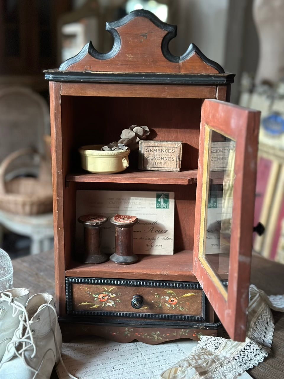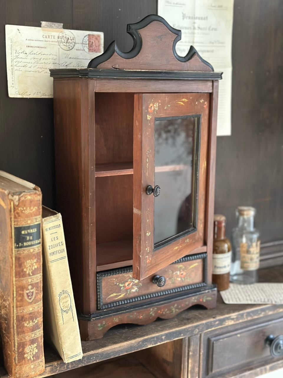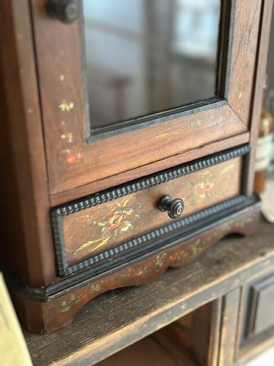 こちらは、フランスの穏やかな地方で、かつて大切に使われていたと思われる、手描きの花装飾が施された小型のキャビネットです。素朴で愛らしい筆致は、ヨーロッパの伝統的なフォークアート(トールペイント)の技法によるものと推測されます。