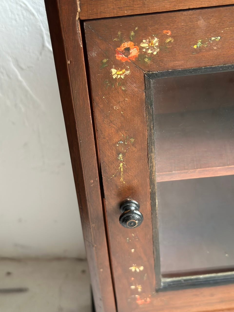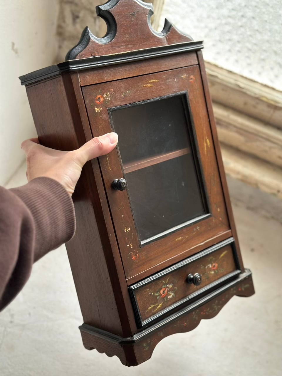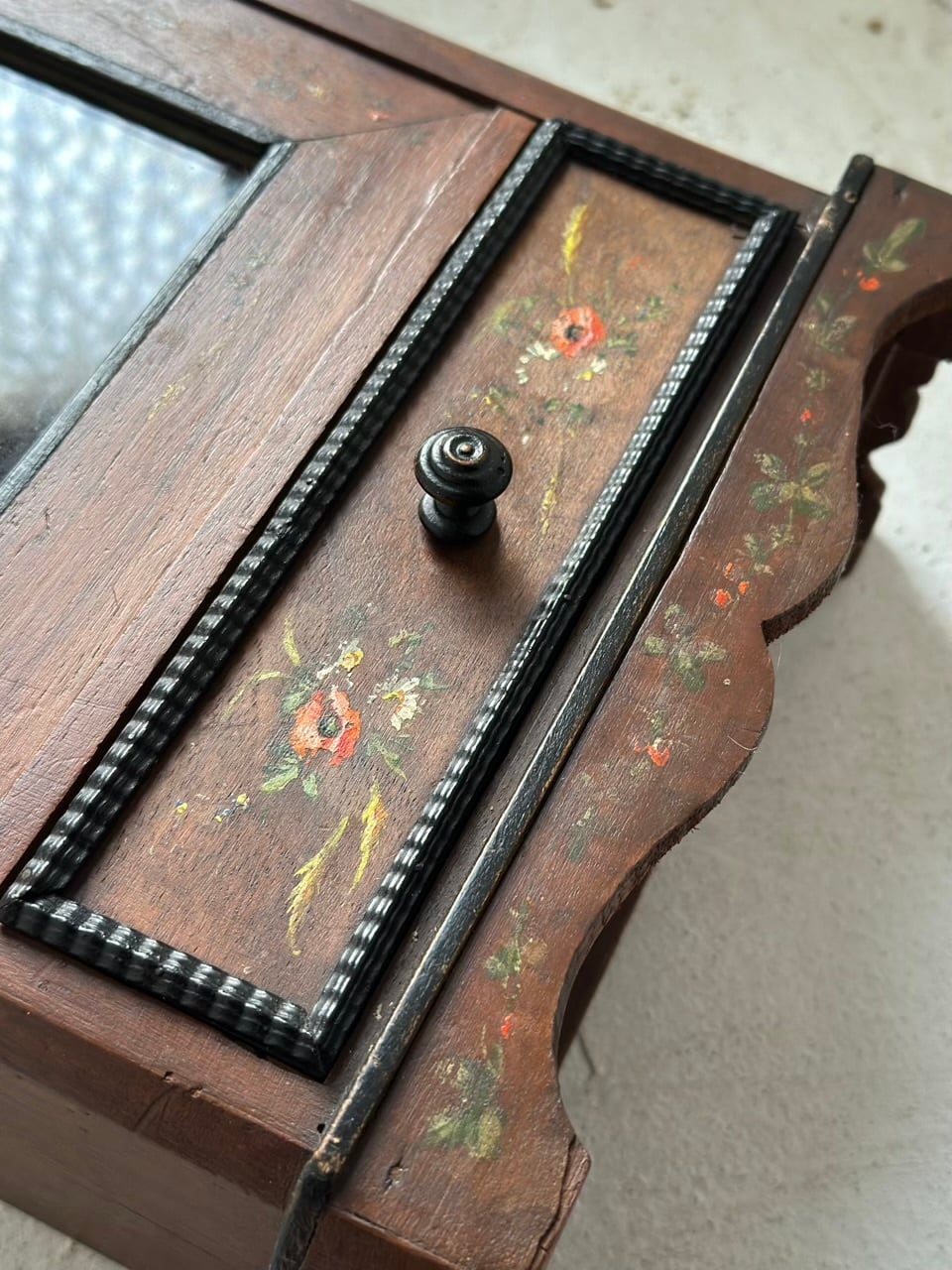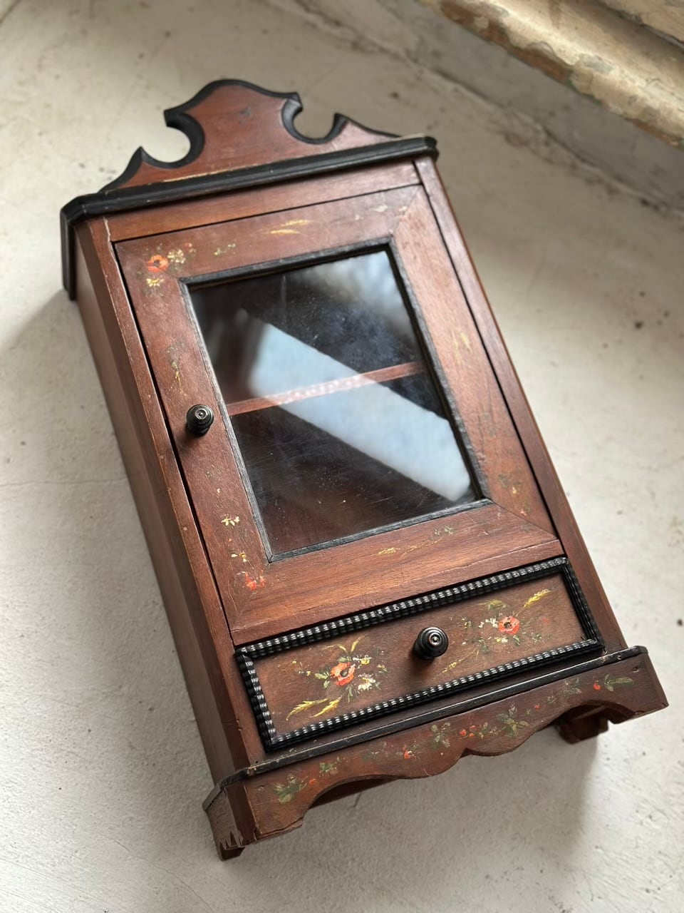 こちらは、フランスの穏やかな地方で、かつて大切に使われていたと思われる、手描きの花装飾が施された小型のキャビネットです。素朴で愛らしい筆致は、ヨーロッパの伝統的なフォークアート(トールペイント)の技法によるものと推測されます。