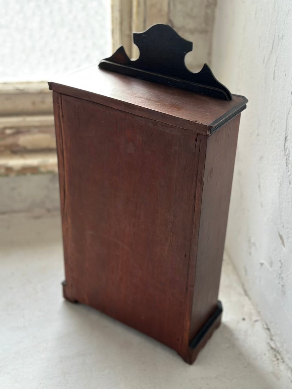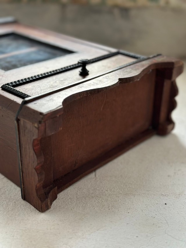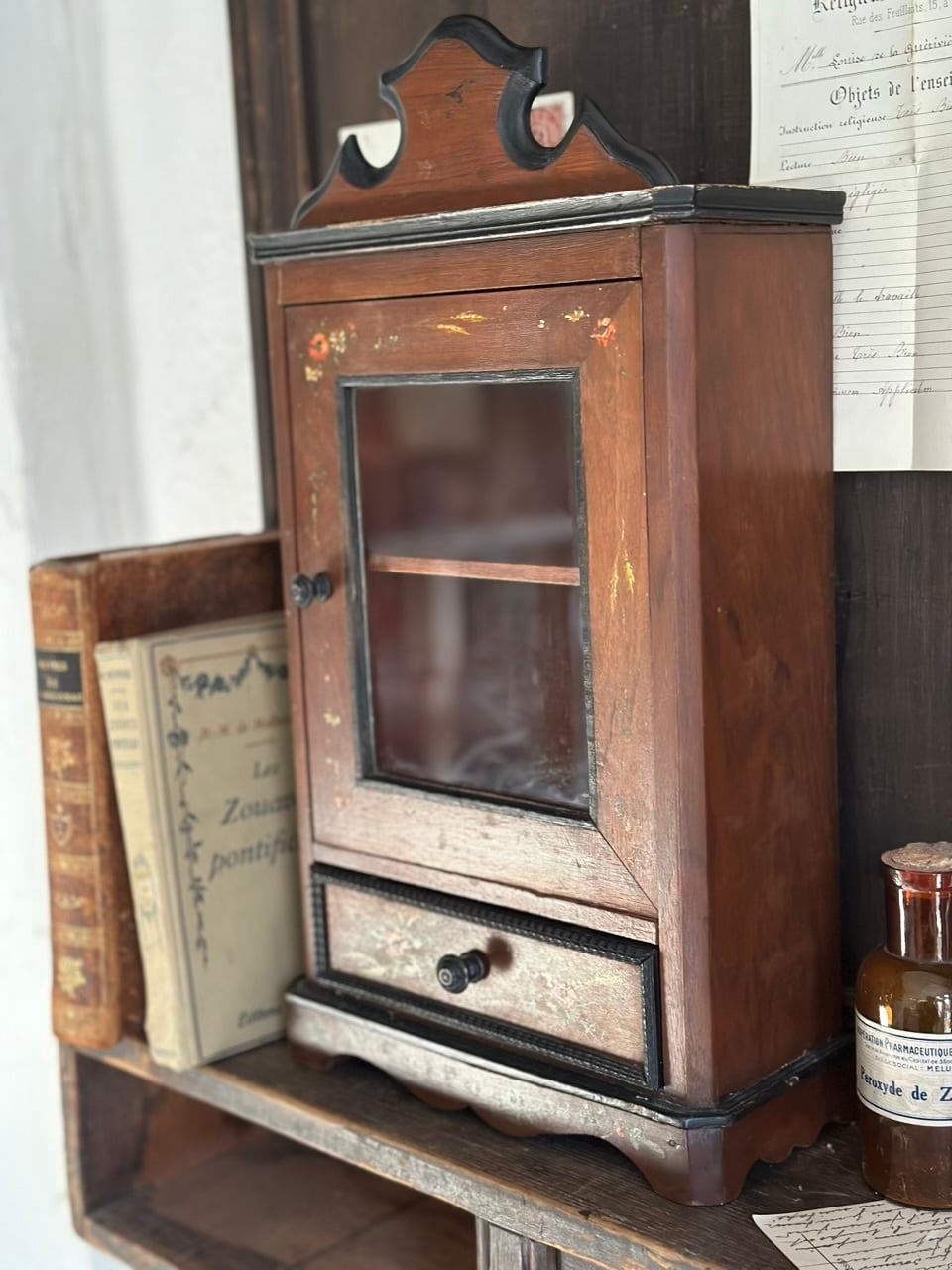 元々は薬やスパイスを整理する収納として、あるいは貴重な品を飾るミニショーケースとして使用されていました。100年以上の時を経た今、深い艶と、角の擦れや小さな傷までもが、かけがえのない歴史の物語となっています。