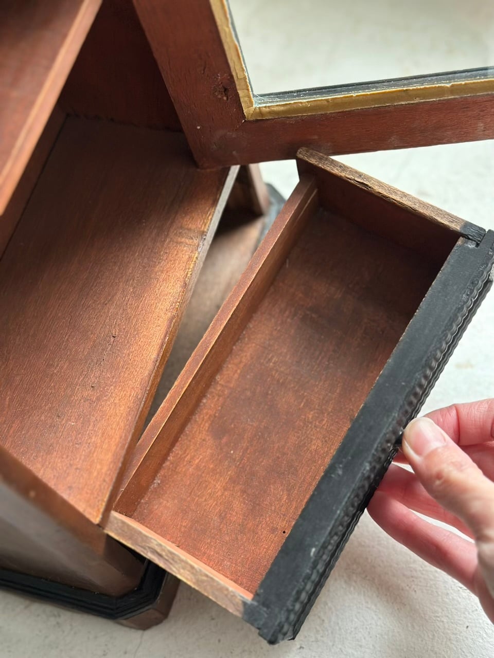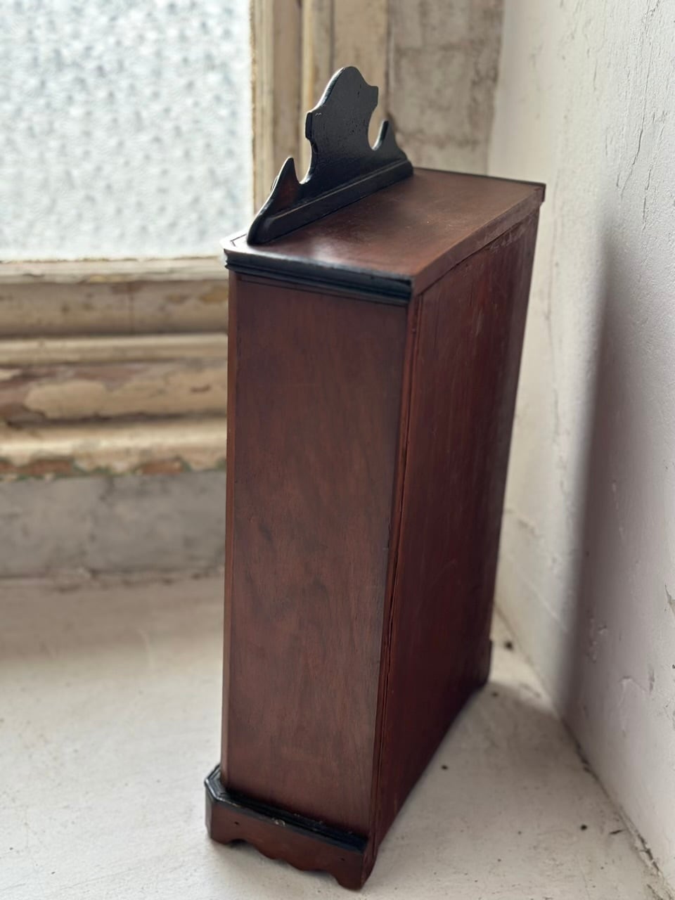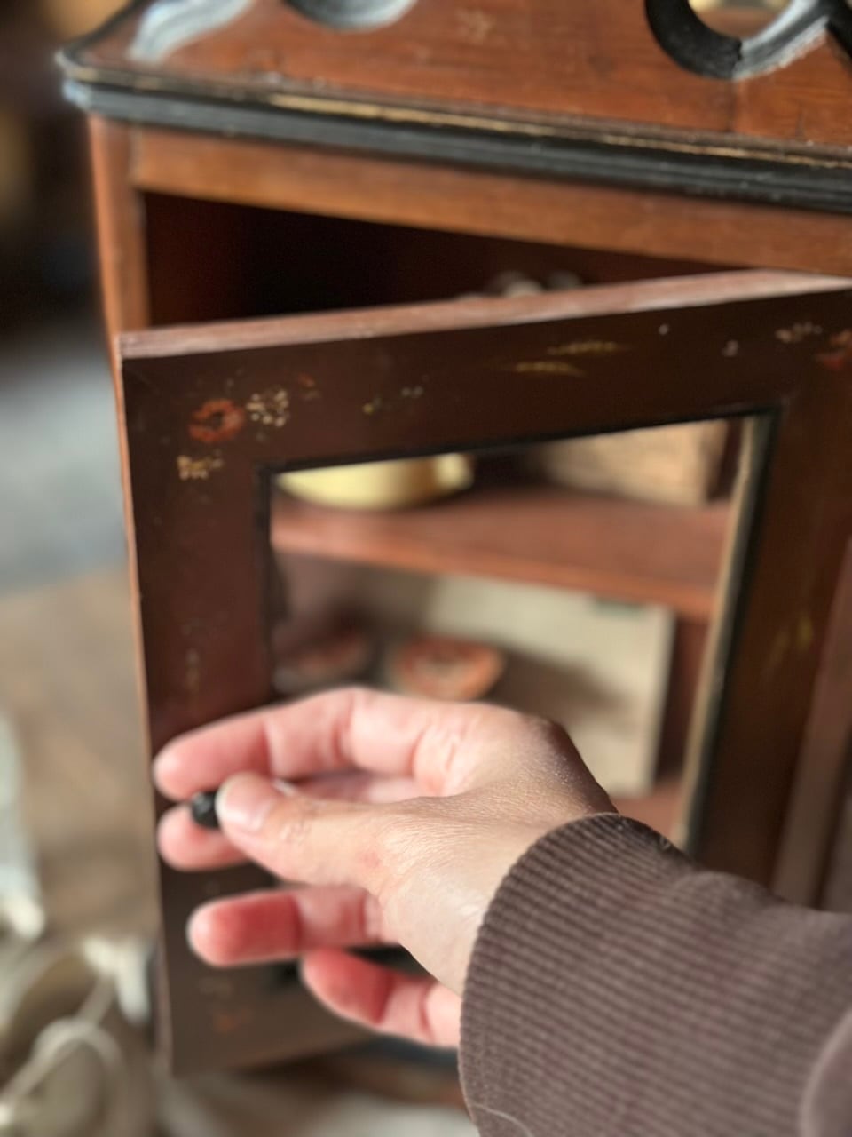元々は薬やスパイスを整理する収納として、あるいは貴重な品を飾るミニショーケースとして使用されていました。100年以上の時を経た今、深い艶と、角の擦れや小さな傷までもが、かけがえのない歴史の物語となっています。