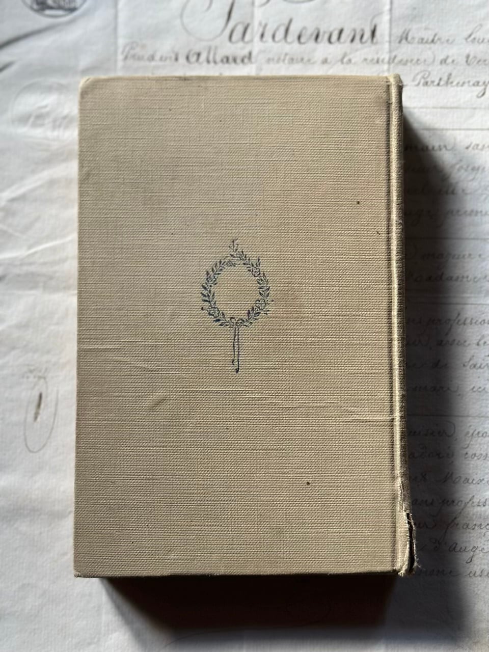 ベージュのクロス装丁には、アール・ヌーヴォーのエッセンスを感じさせる優美なボタニカルモチーフの装飾枠が、深みのある緑がかったブルーで繊細に描かれています。