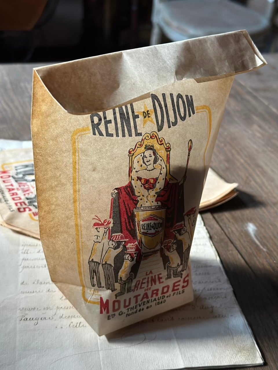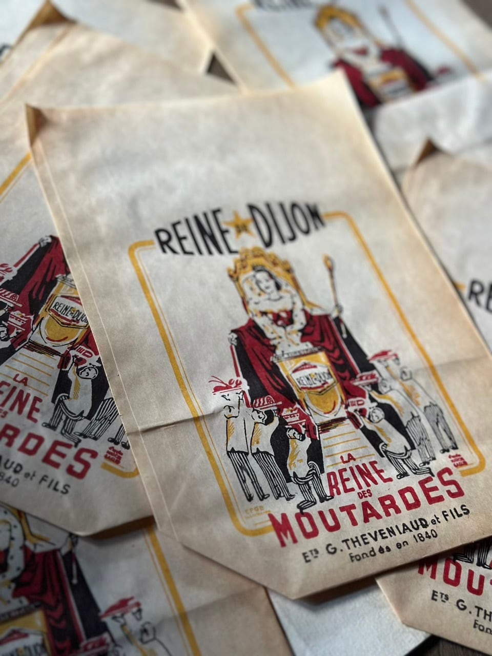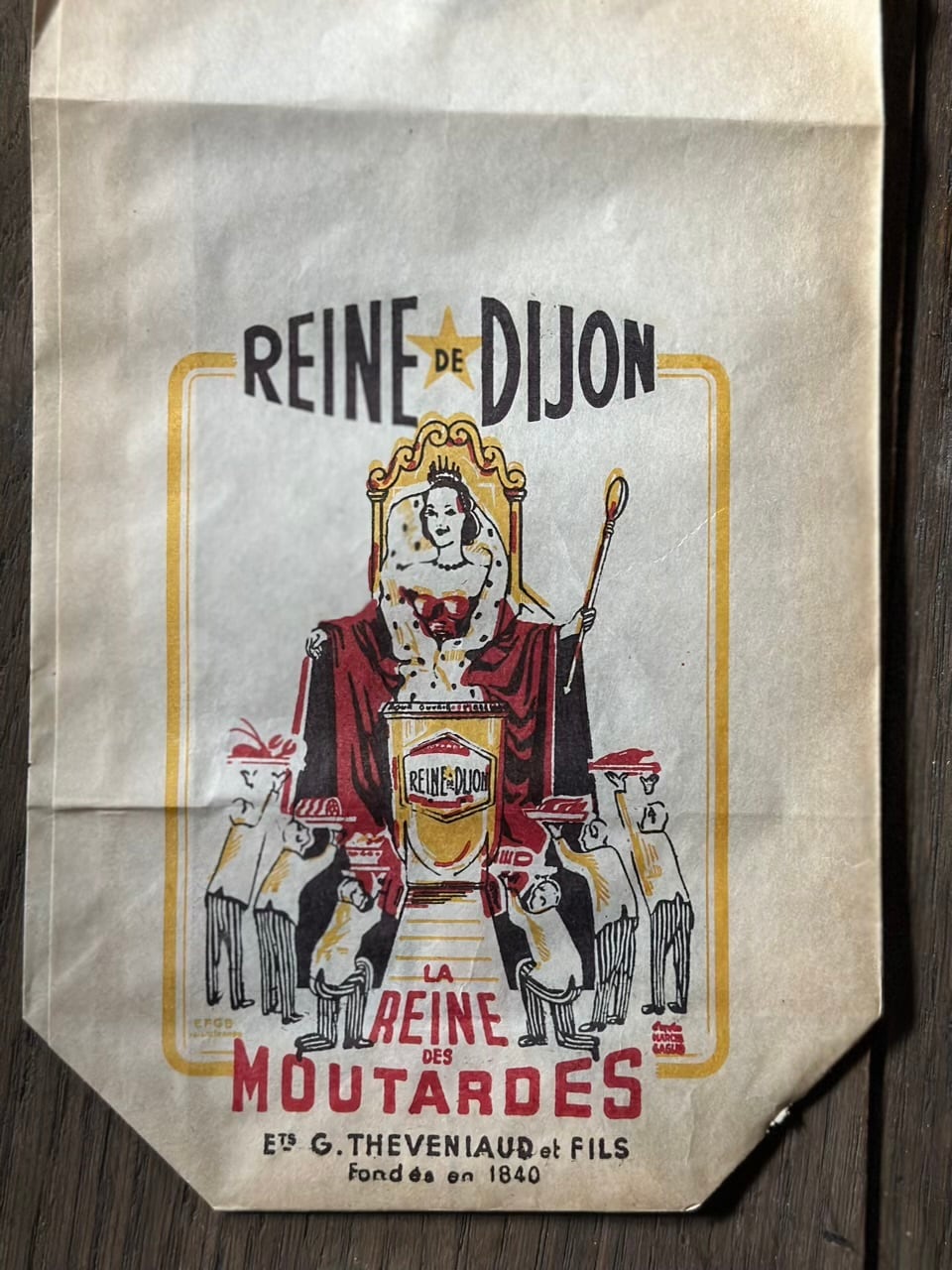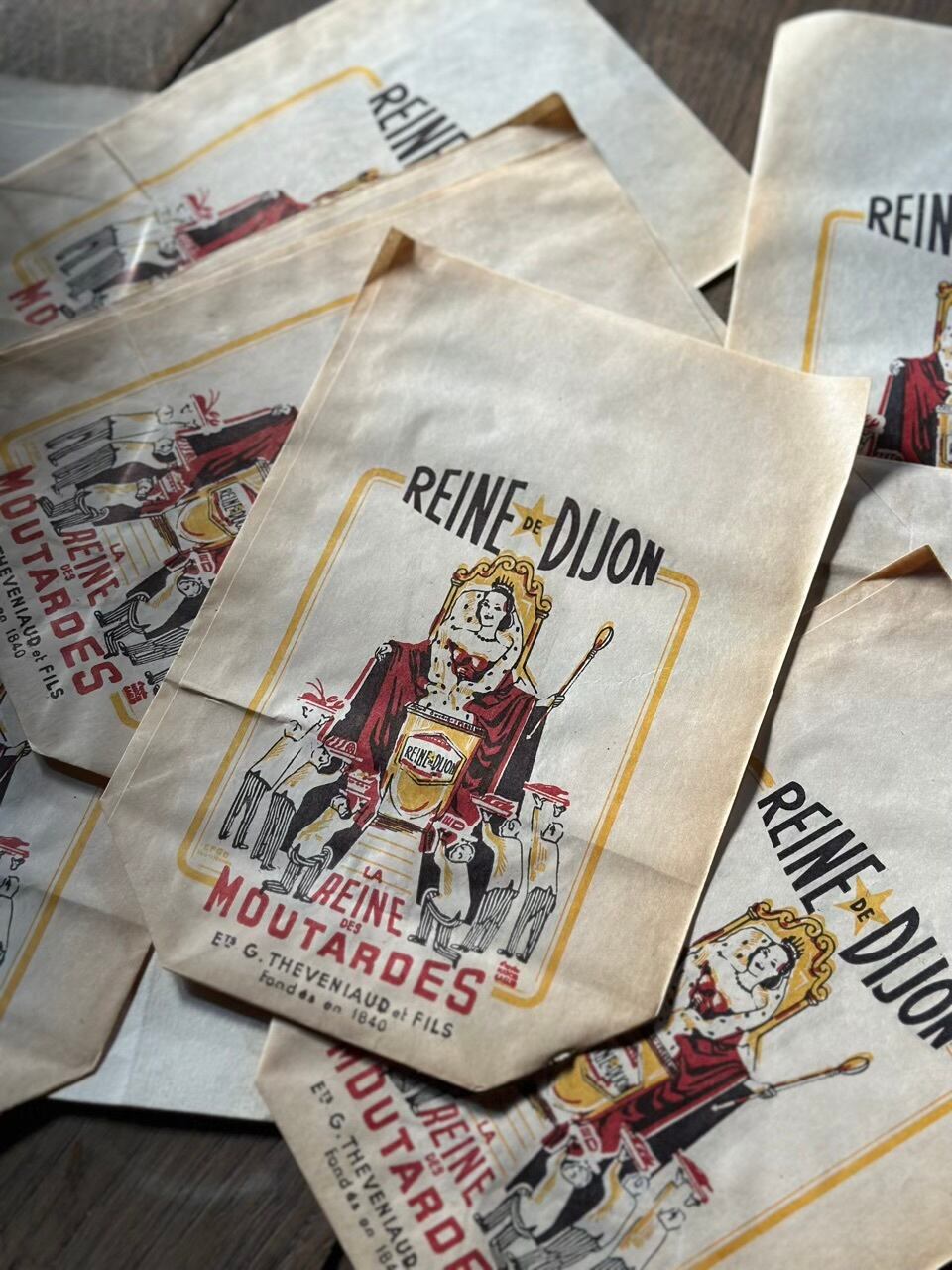 当時、マスタードは量り売りされることも多く、店頭でマスタードの粉末や種、あるいは塊をこの種の紙袋に詰めて販売していました。また、このデザインは、製品がディジョンの最高品質であることを、「女王」のイメージでアピールしています。