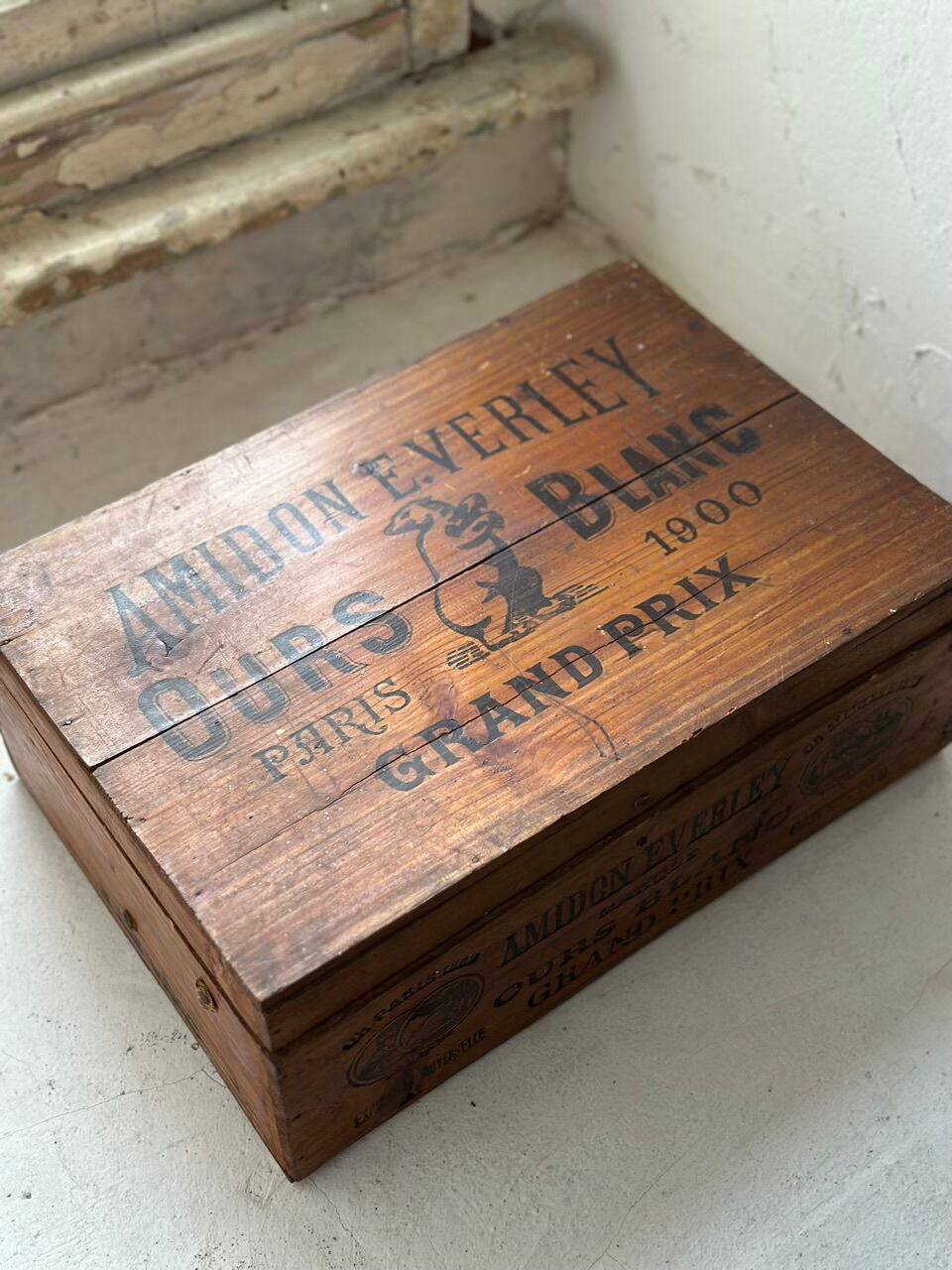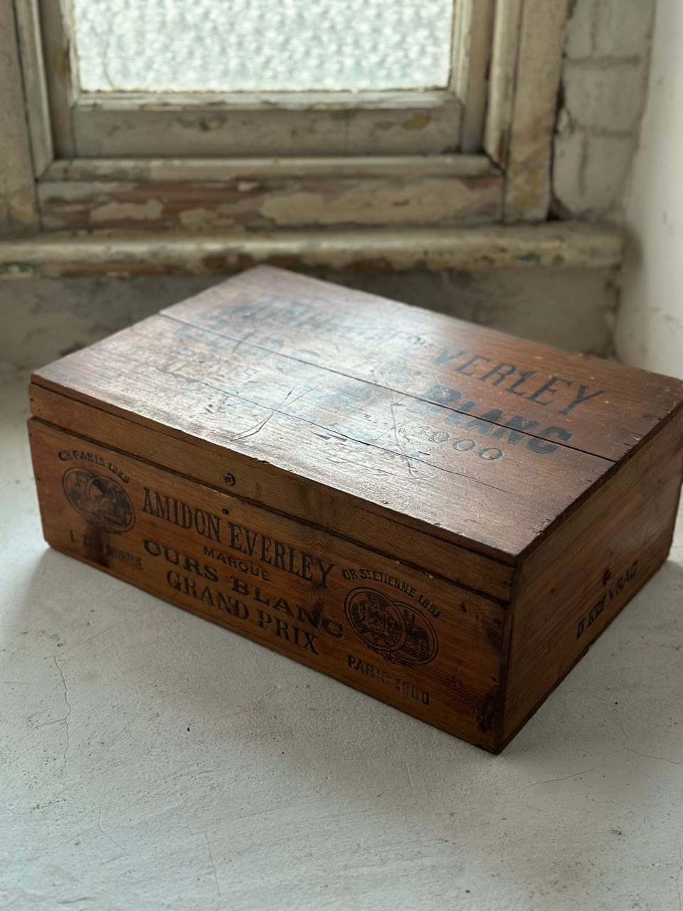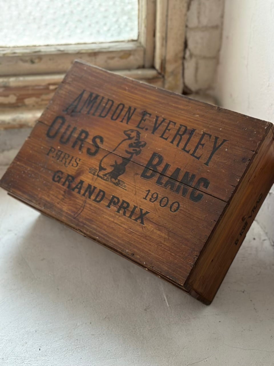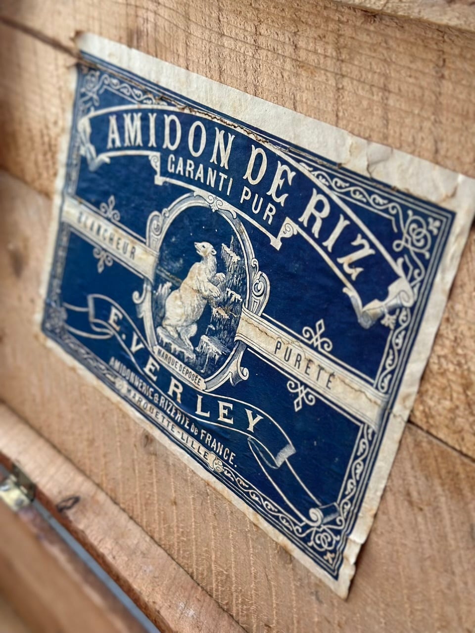 フランスより入荷しました、木製ボックスです。こちらは、フランス・ベルギー国境に近い町、リール近郊の老舗企業 E. VERLEY社が、純粋な米でんぷん(Amidon de Riz)を販売するために用いたアンティーク木箱です。