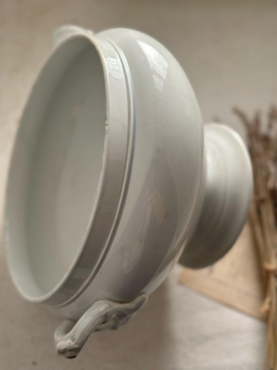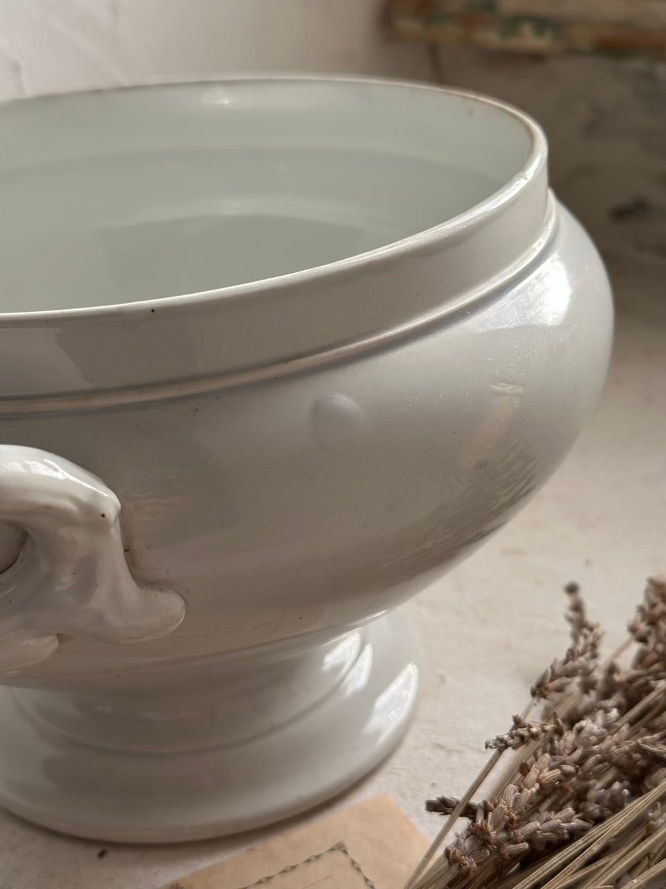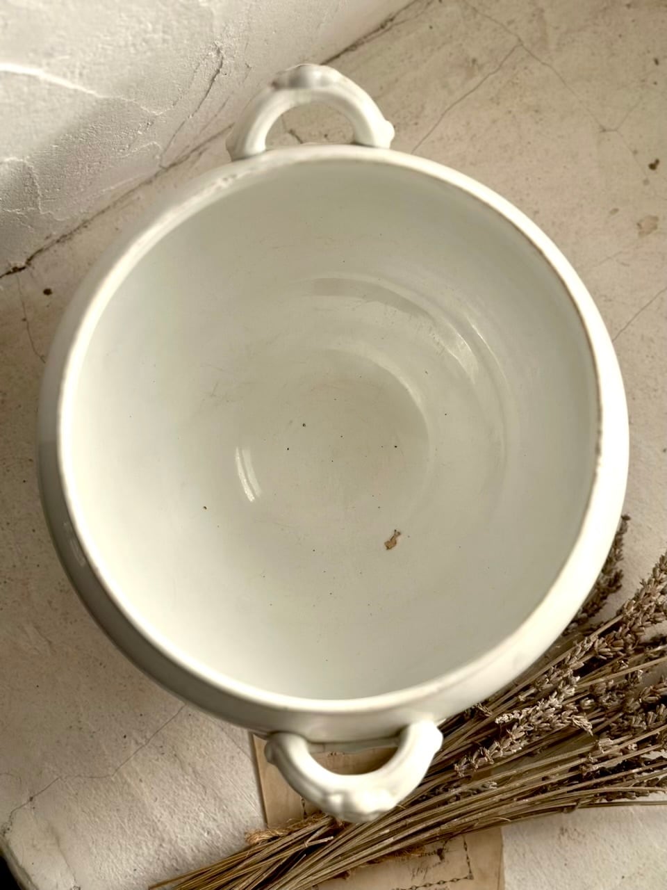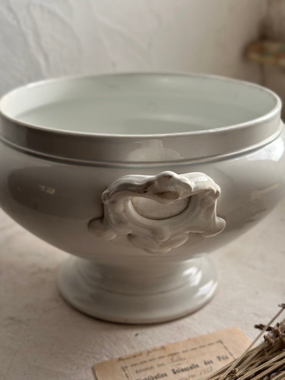 アンティークならではの経年による掠れが、時を重ねた美しさとなり、唯一無二の魅力を湛えています。歴史と物語を秘めたこのスーピエールが、あなたの日常にフランスの優雅なエッセンスを添えてくれるでしょう。