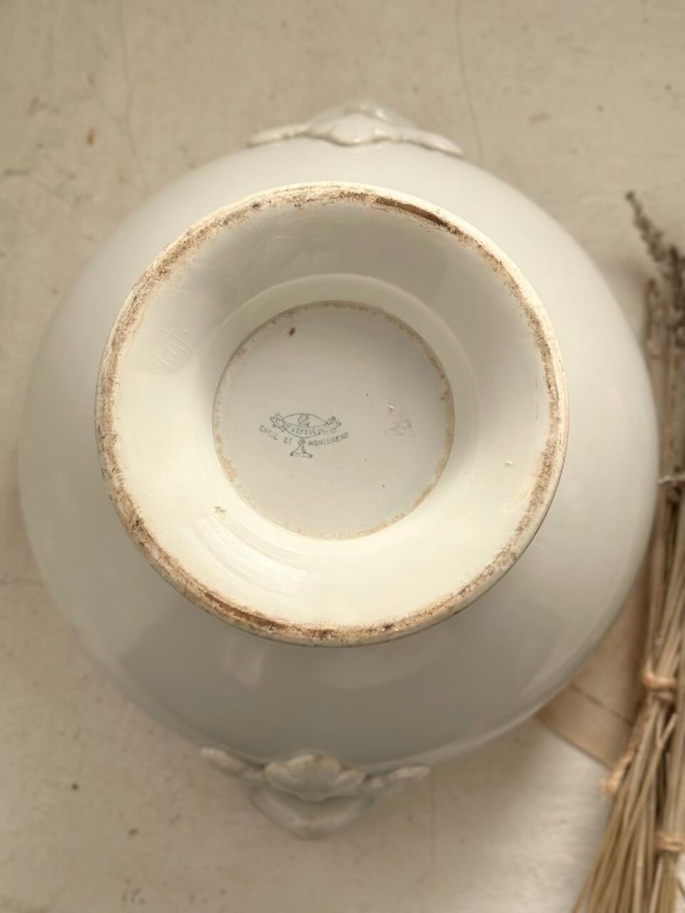 パリのブルジョワジーに愛された名窯、クレイユ・エ・モントローが手がけた、気品あふれる一台です。底に残るブルーの刻印が、悠久の時を超えてこの器の歴史を静かに物語ります。