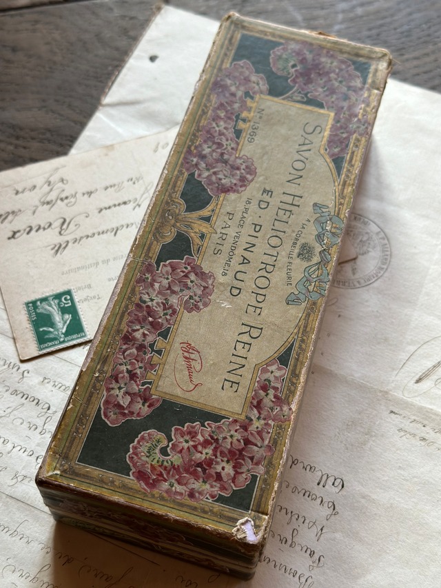 フランスより入荷しました、1830年創業、かつてのフランス宮廷御用達メゾン「Ed. Pinaud(エド・ピノー)」のアンティーク石鹸ボックスです。蓋を飾るのは、咲き誇るエリオトロープの花々と、繊細なグラフィック。