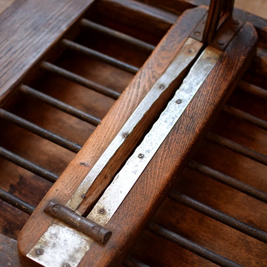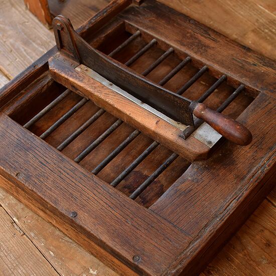 フランスで買い付けしました、ナイフ付きのパン切り台 カッティングボードです。パンをカットするとパン屑が下に落ちる仕組みとなっており、引き出しは出し入れができます。大変古いものですので、ディスプレイとしてお使いください。