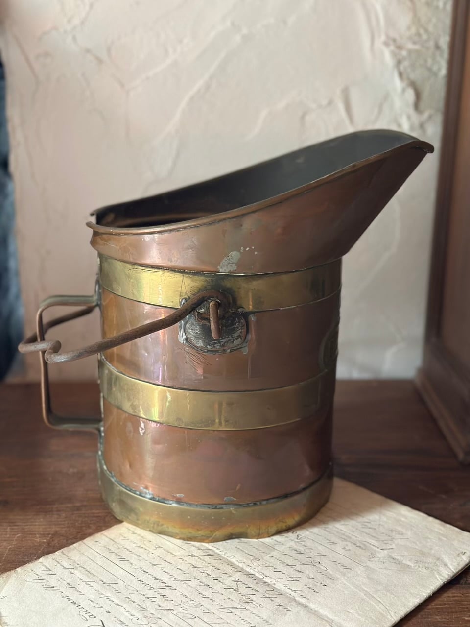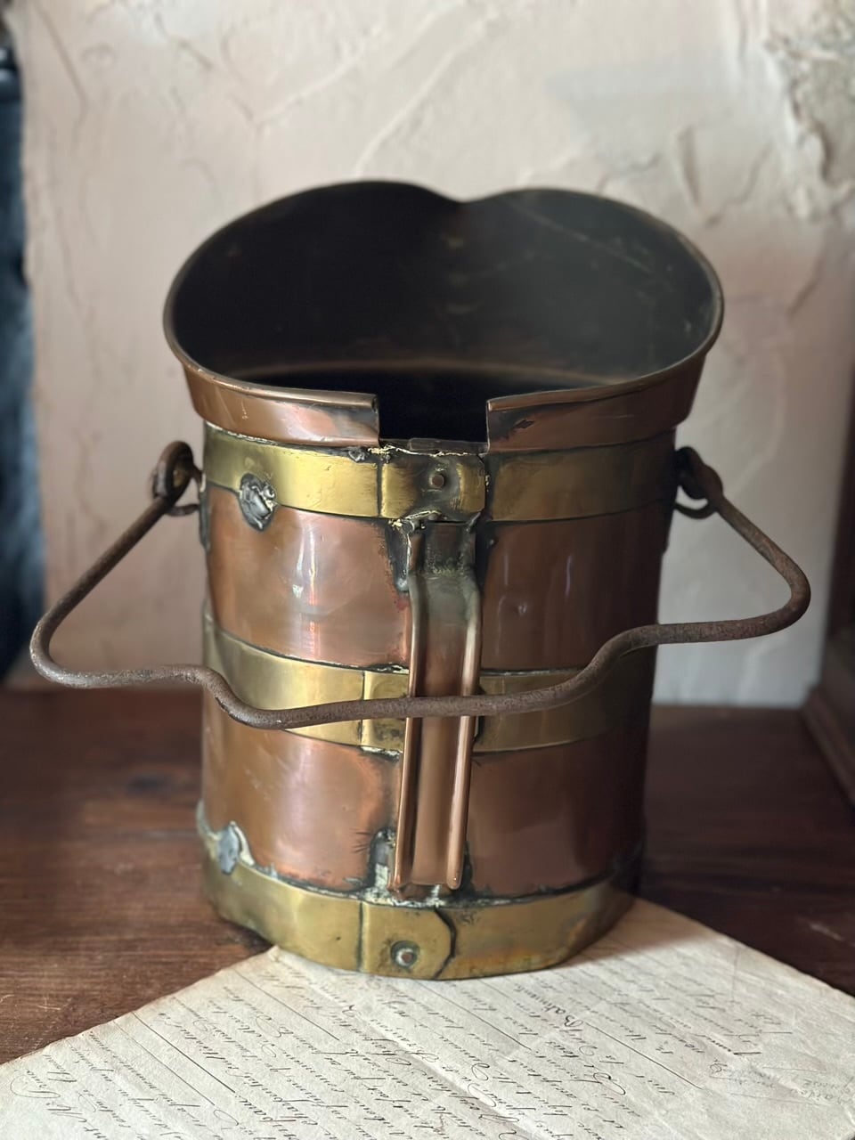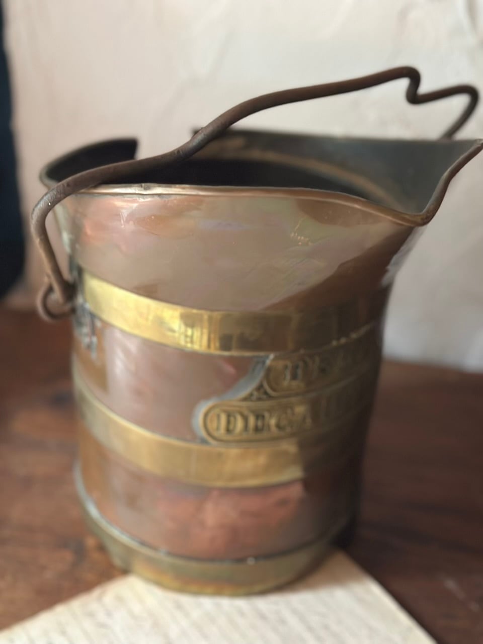 銅の温かみのある輝きと、真鍮の装飾的なラインが織りなすコントラストは、まさにフランス・アンティークの王道。前面に誇らしげに掲げられたエンボス文字も素敵ですね。