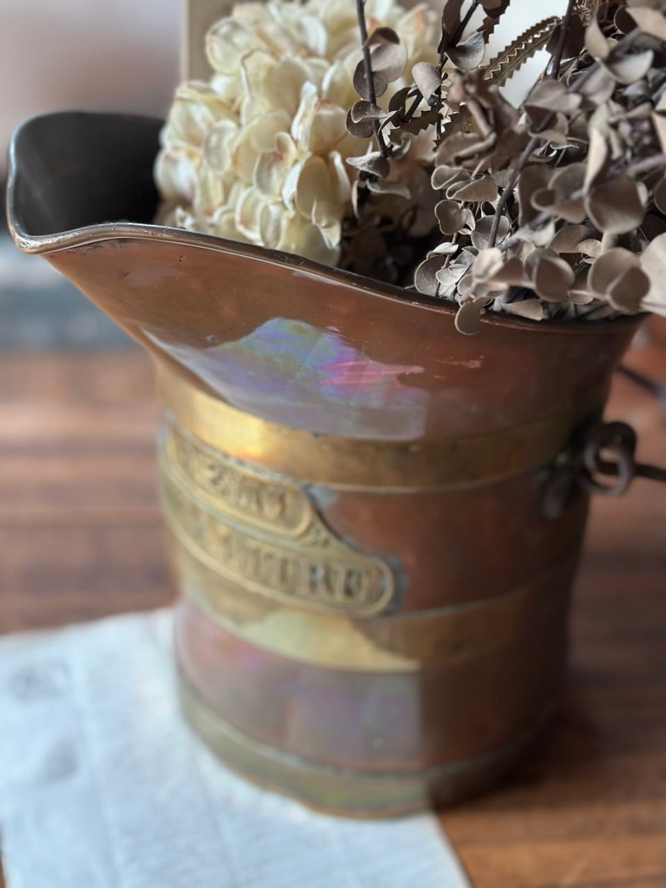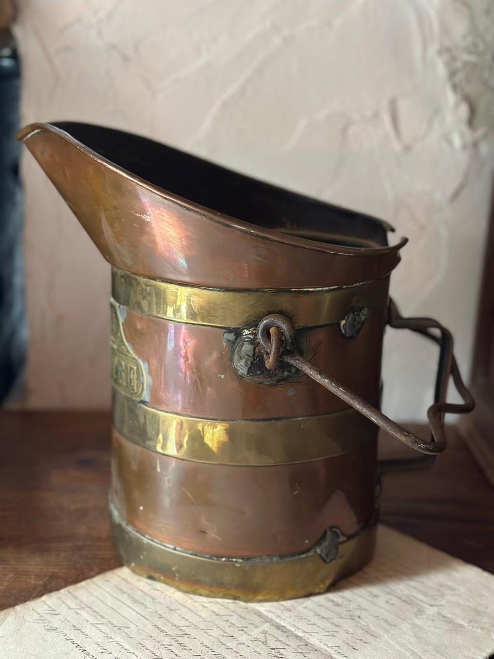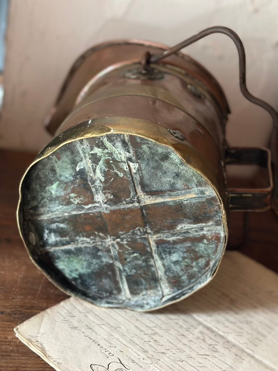 銅の温かみのある輝きと、真鍮の装飾的なラインが織りなすコントラストは、まさにフランス・アンティークの王道。前面に誇らしげに掲げられたエンボス文字も素敵ですね。