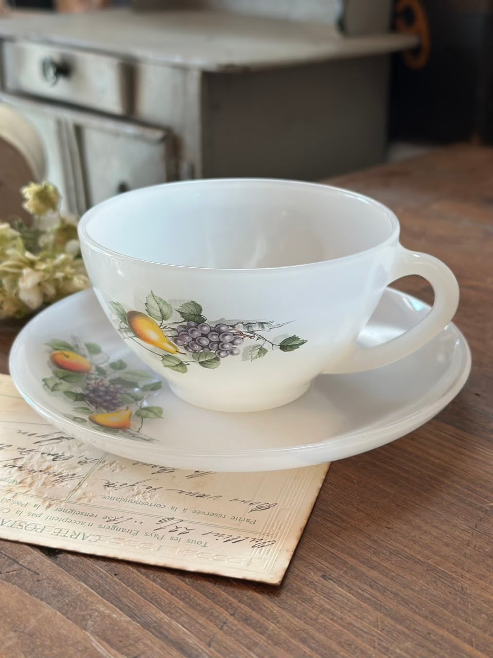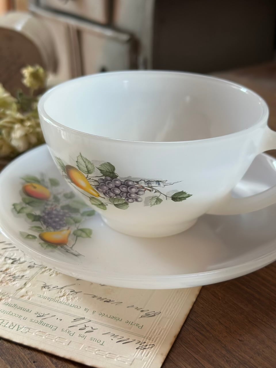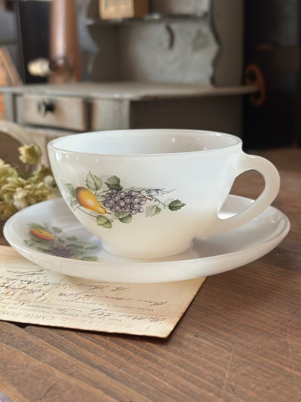 こちらは、光を優しく透かす乳白色のミルクガラスに、梨や葡萄といった「実りの果実」が繊細に描かれたヴィンテージ・カップ&ソーサーです。