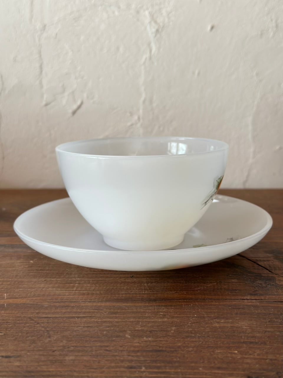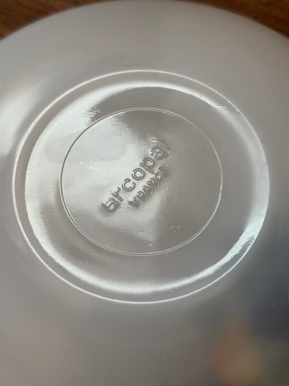 「オパールガラス」と呼ばれる強化ガラスの一種で、陶器のような滑らかさと、ガラスの耐久性を兼ね備えています。当時から「割れにくく実用的な美しさ」でフランスの家庭に広く普及しました。