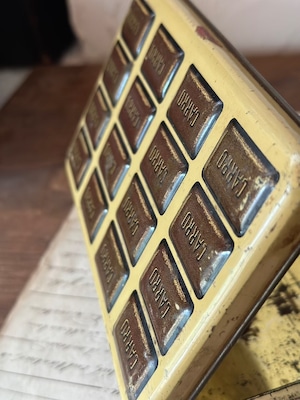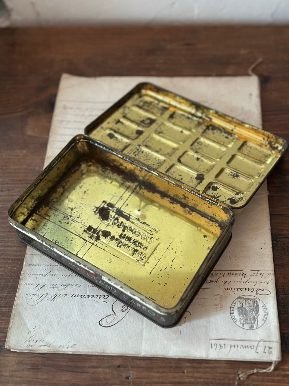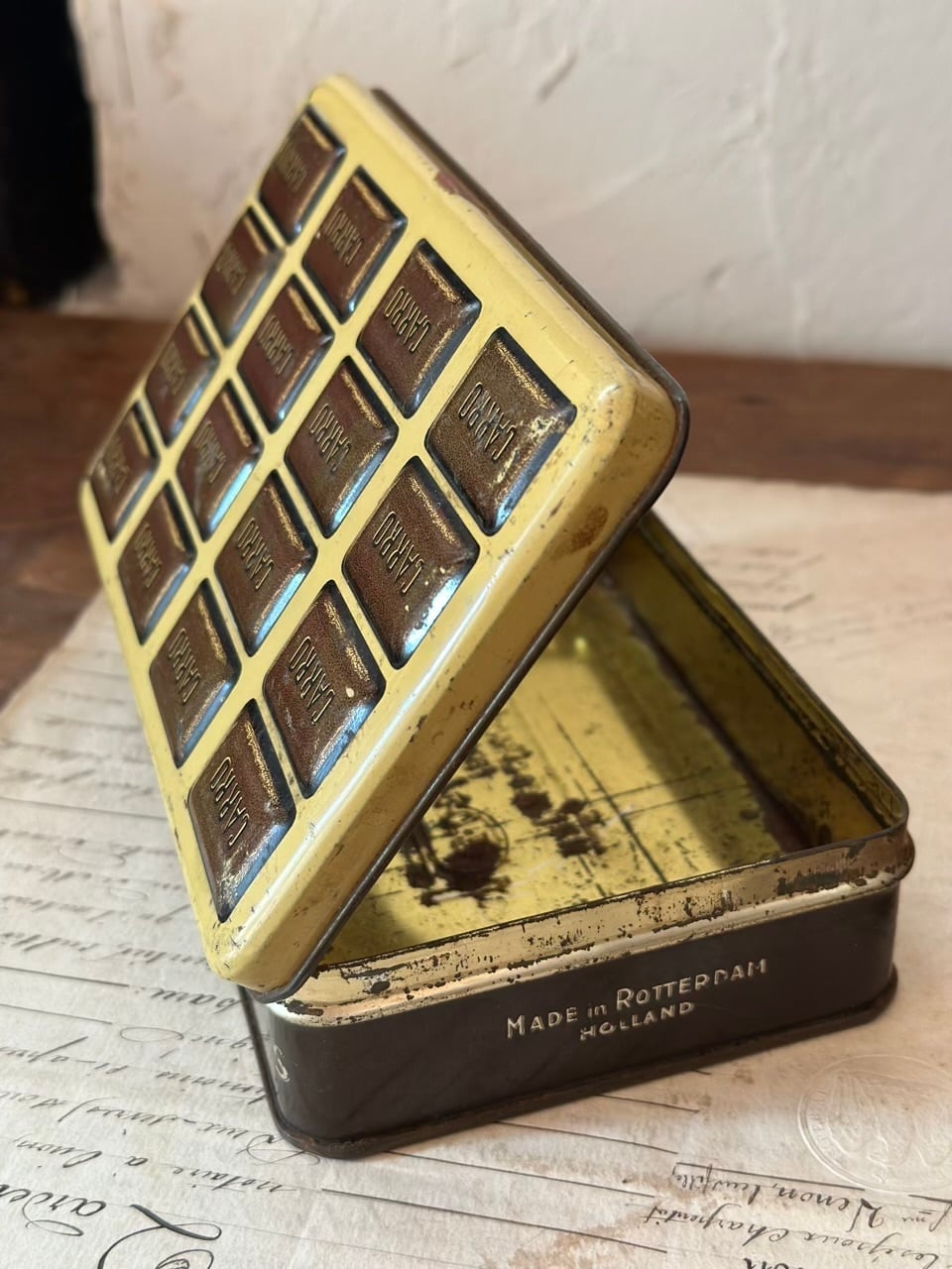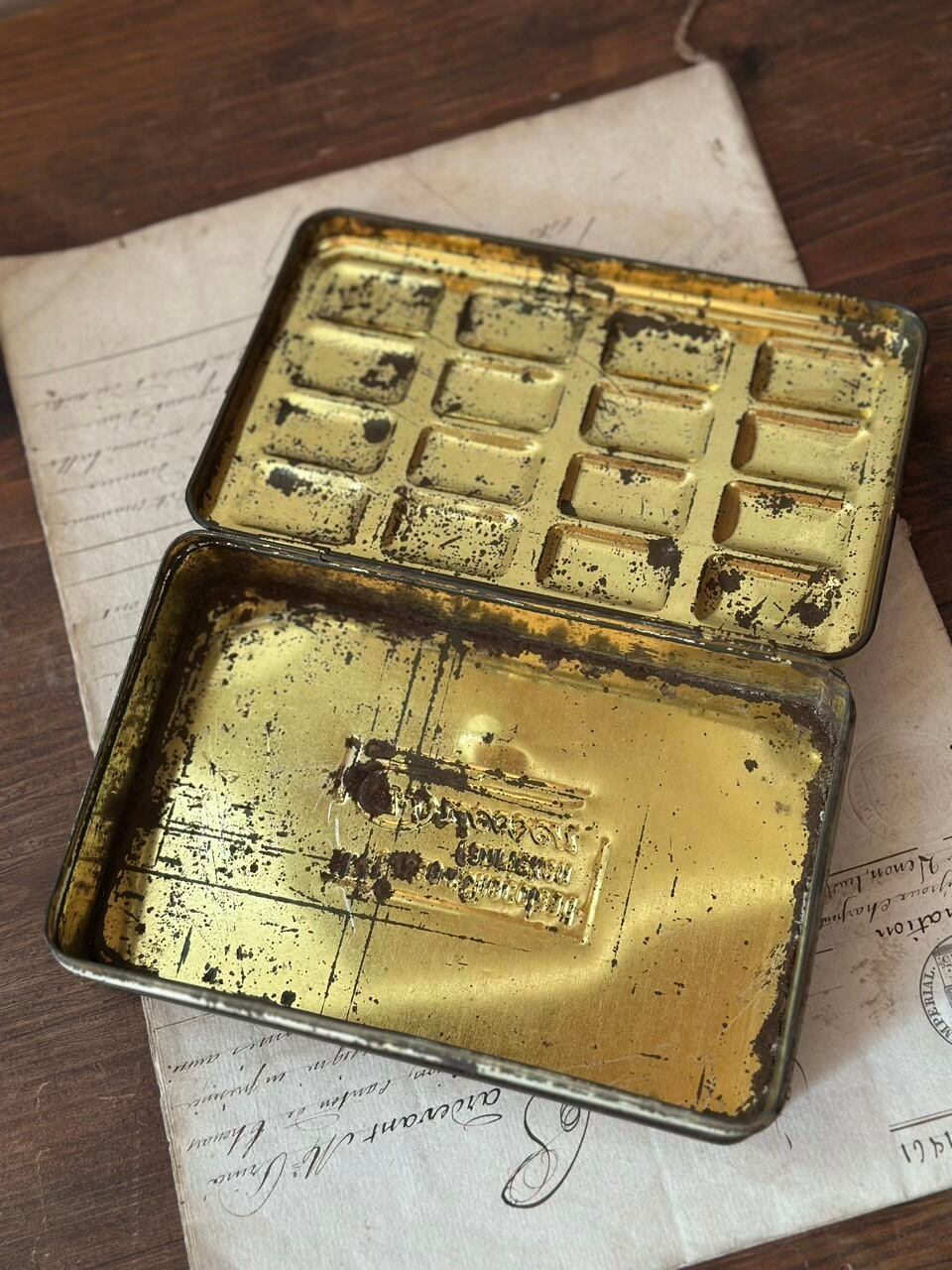 蓋に描かれているのは、当時詰められていたチョコレートそのままの姿。整然と並ぶタイルのようなデザインは、アール・デコ期の潔い美しさを感じさせます。