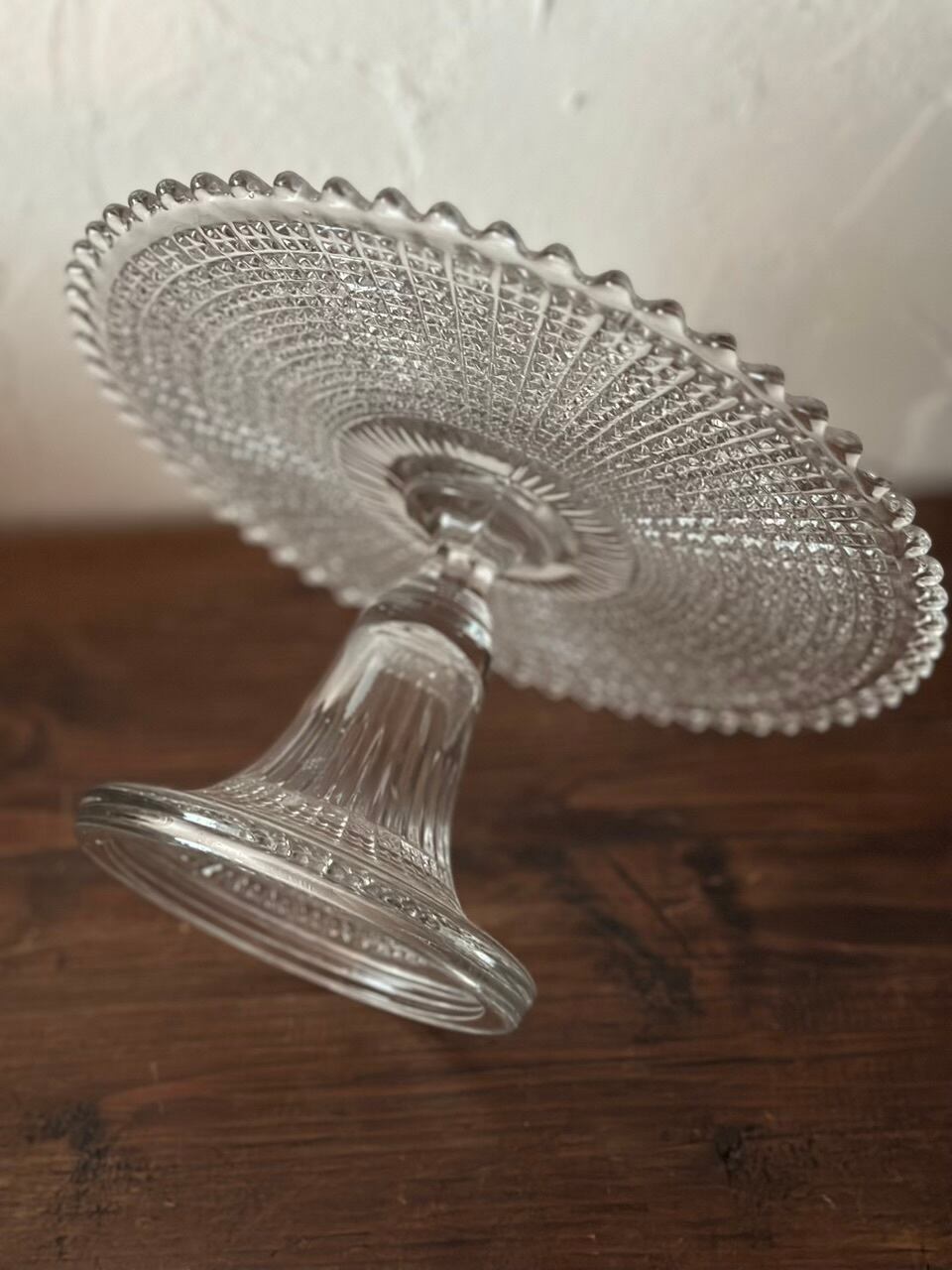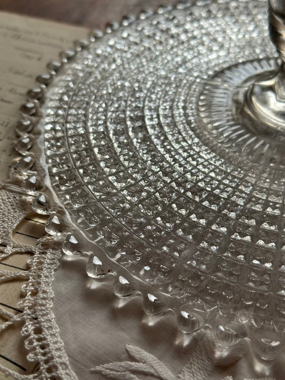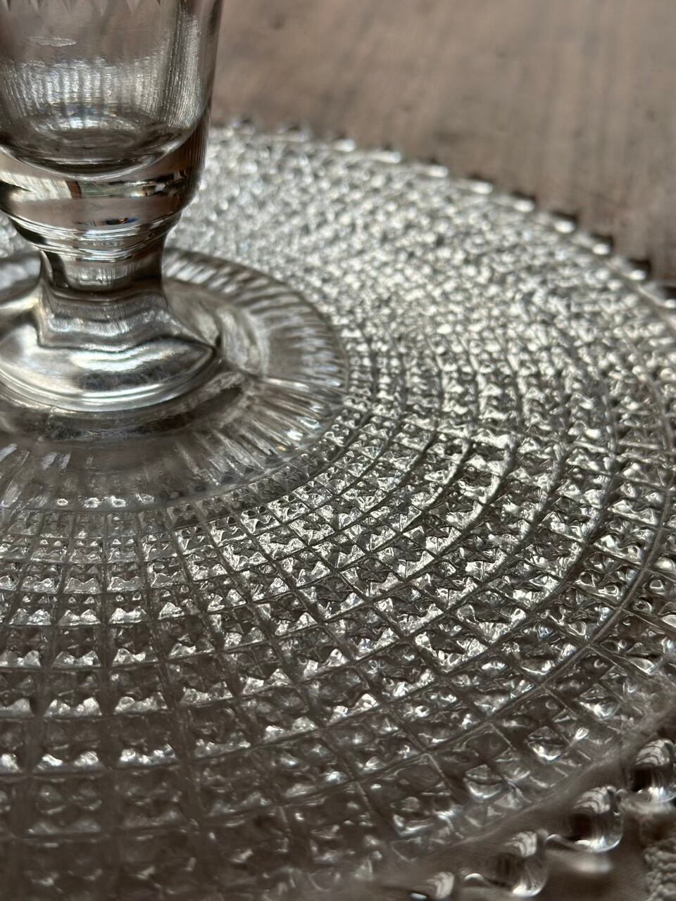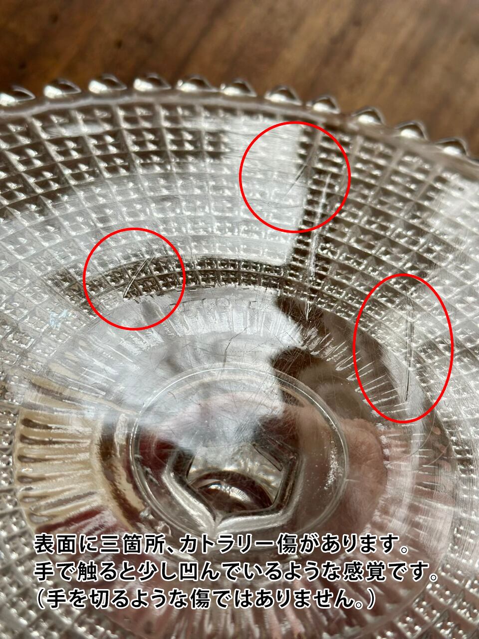 このお品物の最大の特徴は、プレートの縁を彩るダイヤモンド・ポイントと呼ばれるカッティング。その名の通り、ダイヤモンドの結晶のように精密な型押しガラスが、わずかな光を捕らえて複雑な反射を生み出します。
