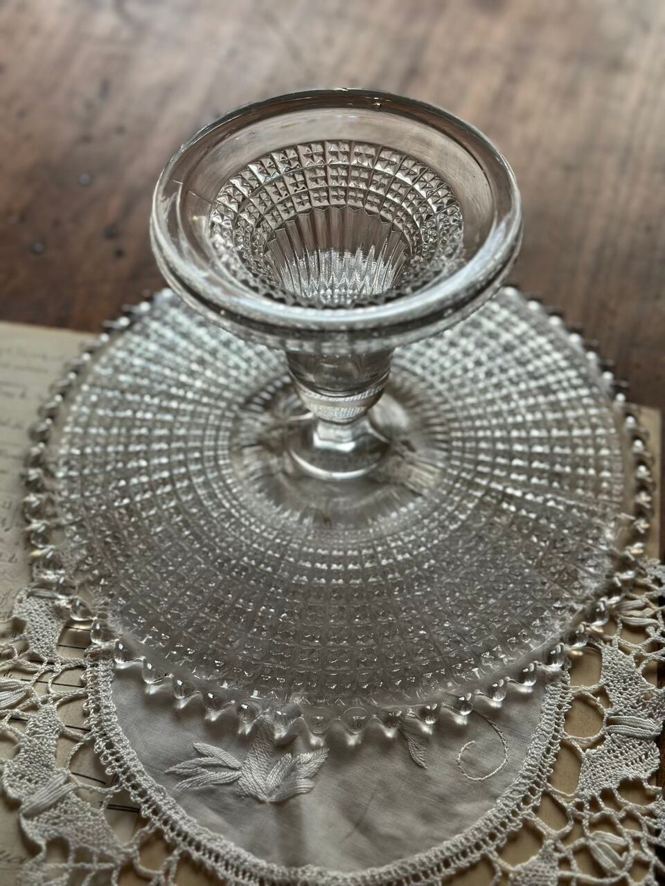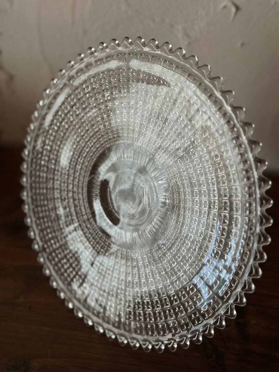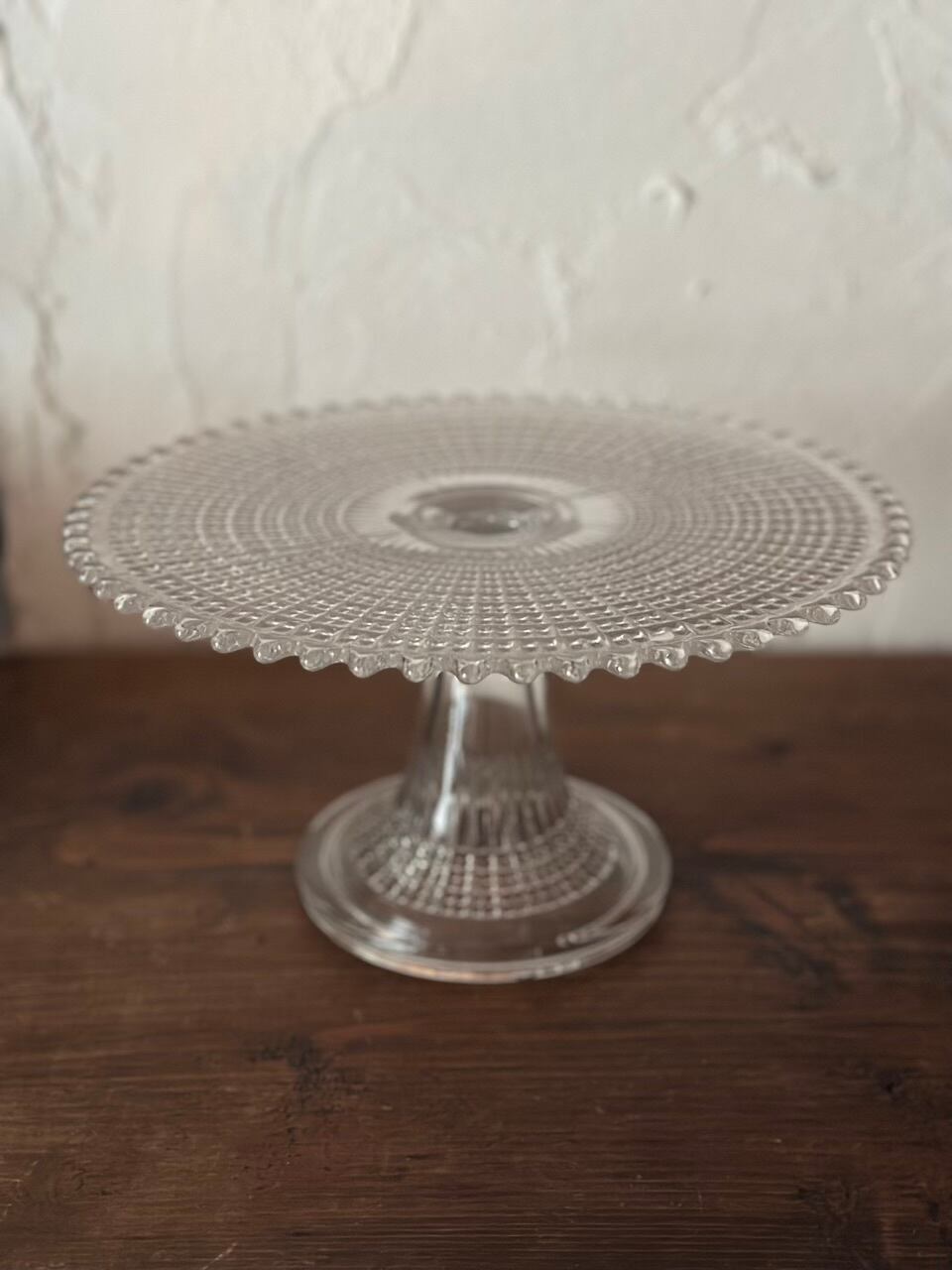 このお品物の最大の特徴は、プレートの縁を彩るダイヤモンド・ポイントと呼ばれるカッティング。その名の通り、ダイヤモンドの結晶のように精密な型押しガラスが、わずかな光を捕らえて複雑な反射を生み出します。