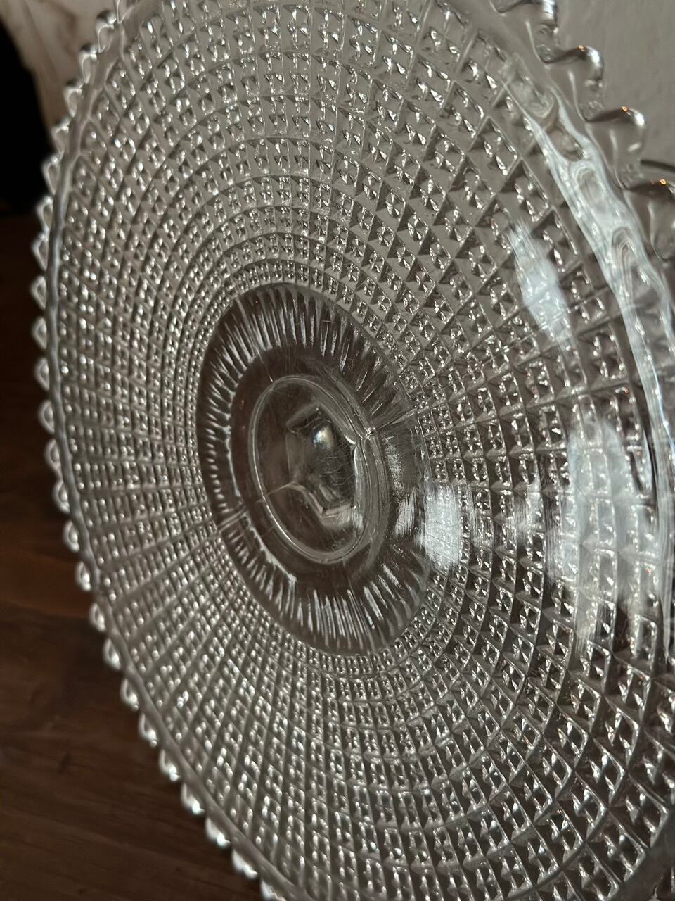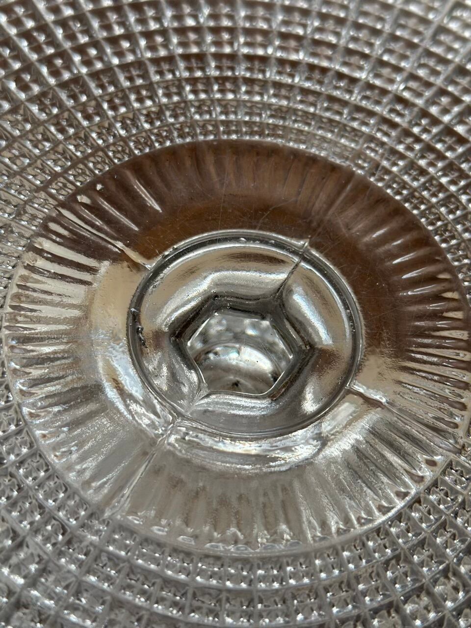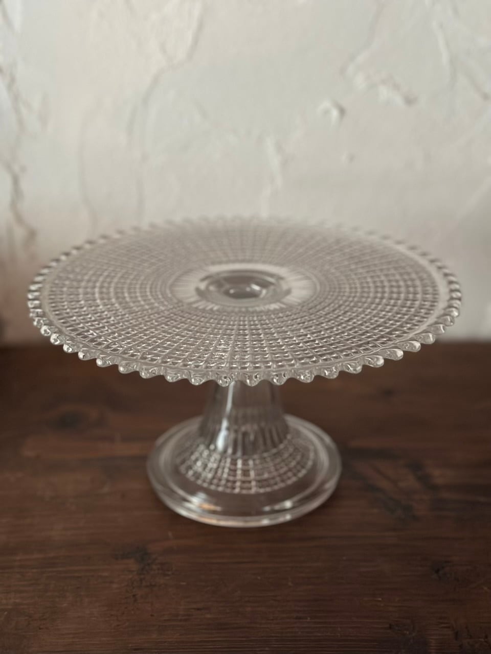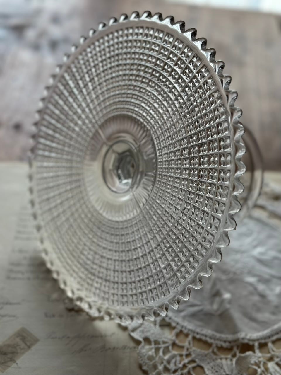 このお品物の最大の特徴は、プレートの縁を彩るダイヤモンド・ポイントと呼ばれるカッティング。その名の通り、ダイヤモンドの結晶のように精密な型押しガラスが、わずかな光を捕らえて複雑な反射を生み出します。