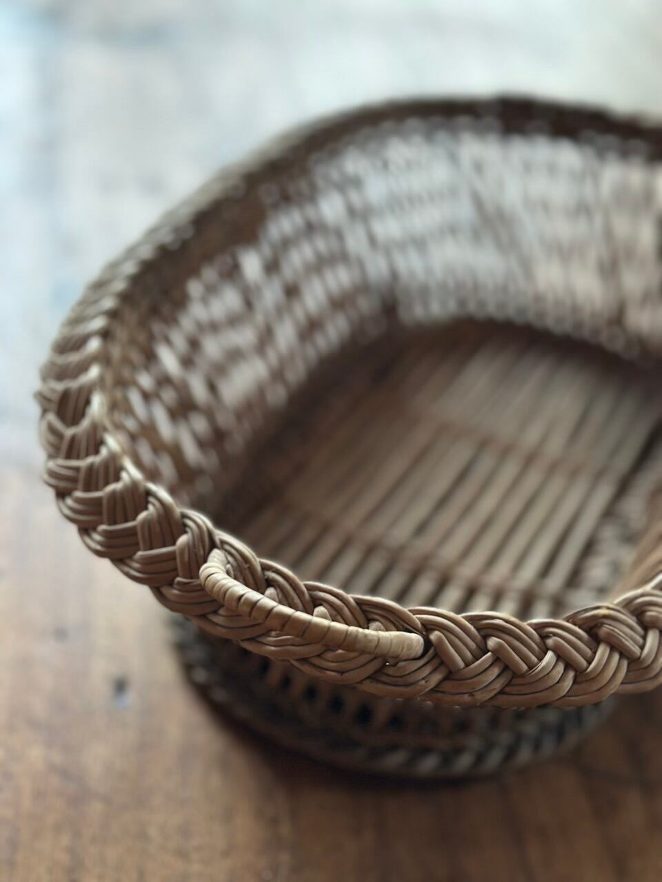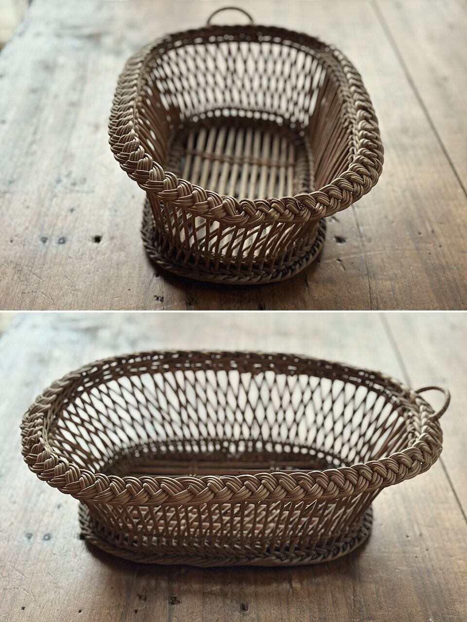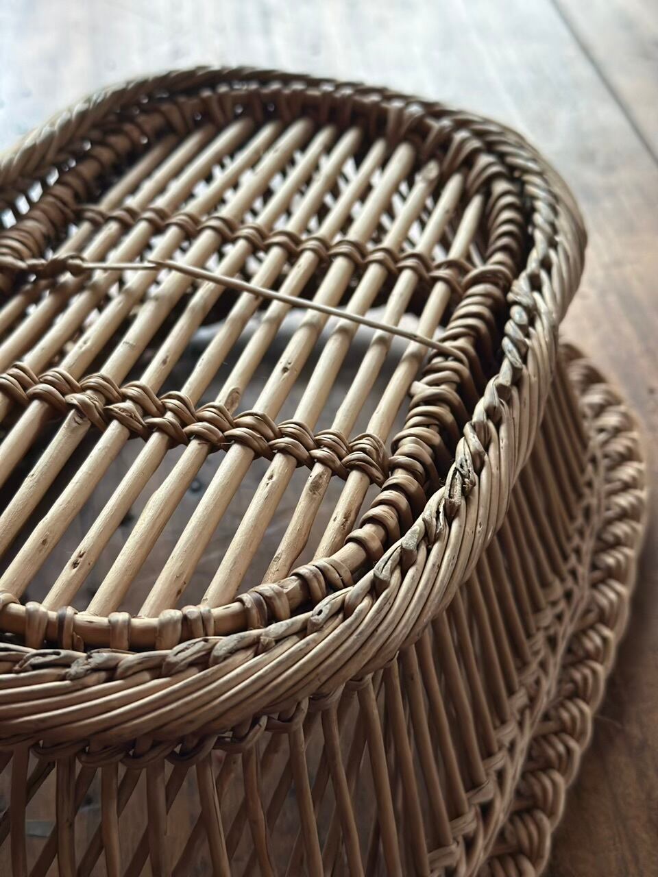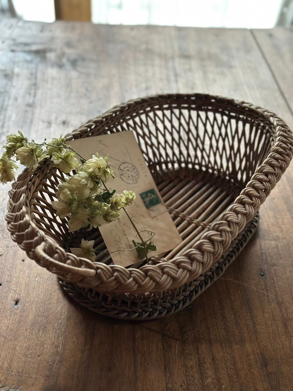 フランスの古い暮らしの中で大切に使われてきた、手編みのアンティーク・バスケットです。長い年月を経て、自然素材が深みのある美しい色へと育っており、置くだけでその場の空気をしっとりと落ち着かせてくれるような佇まいをしています。