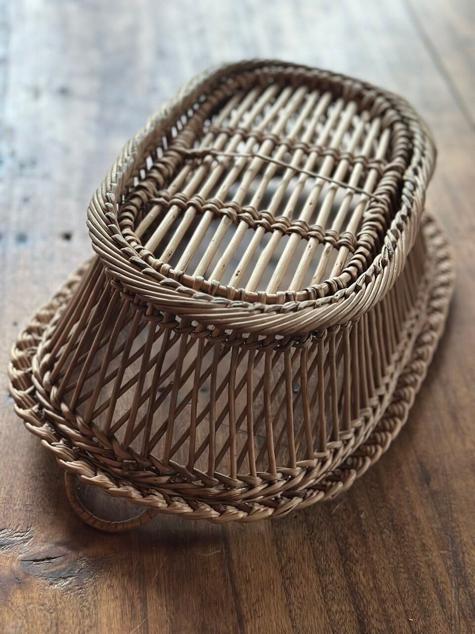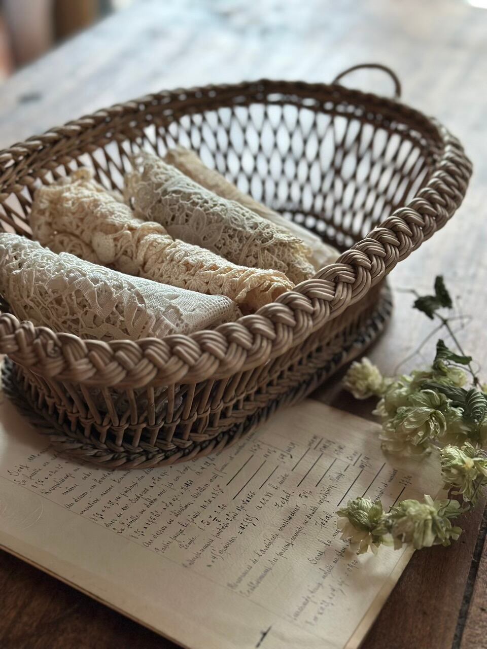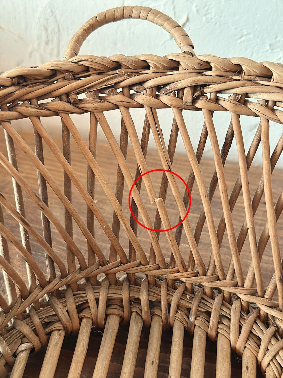 フランスの古い暮らしの中で大切に使われてきた、手編みのアンティーク・バスケットです。長い年月を経て、自然素材が深みのある美しい色へと育っており、置くだけでその場の空気をしっとりと落ち着かせてくれるような佇まいをしています。