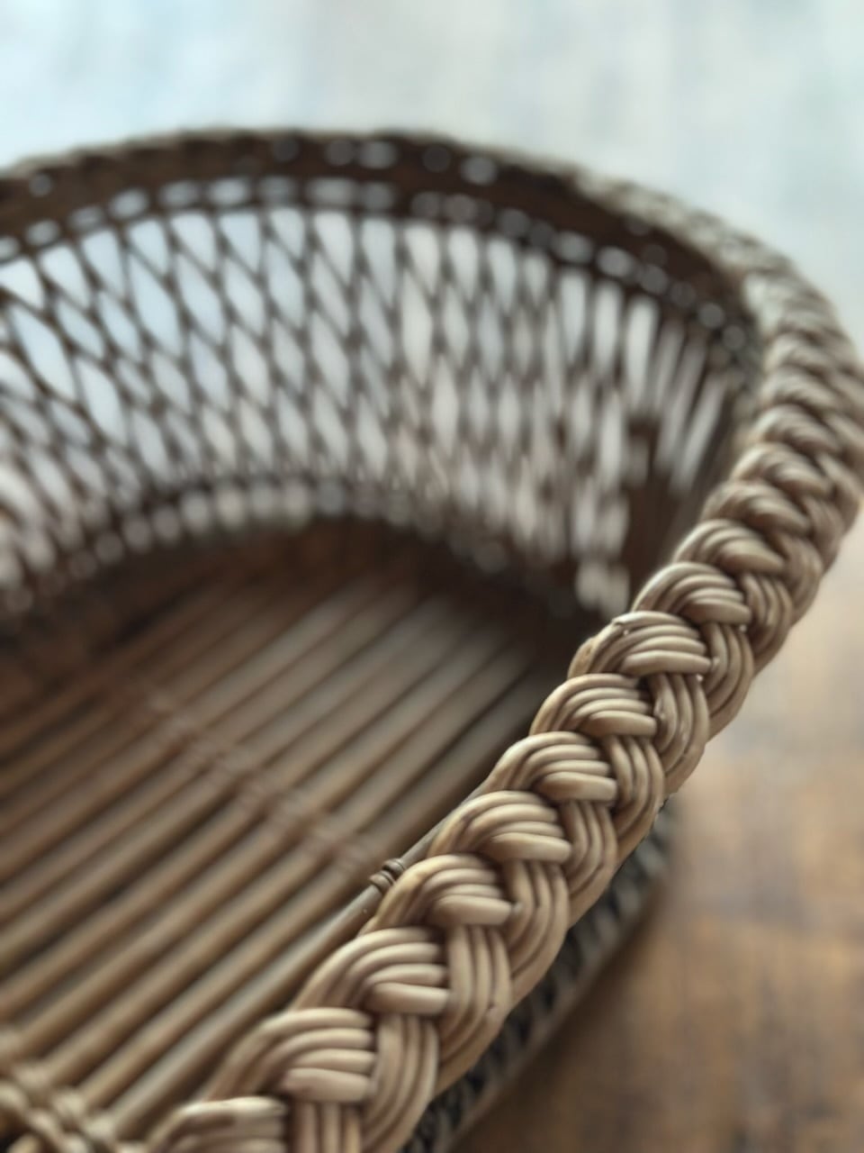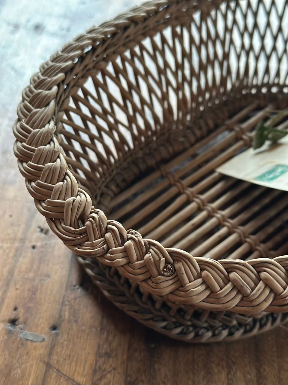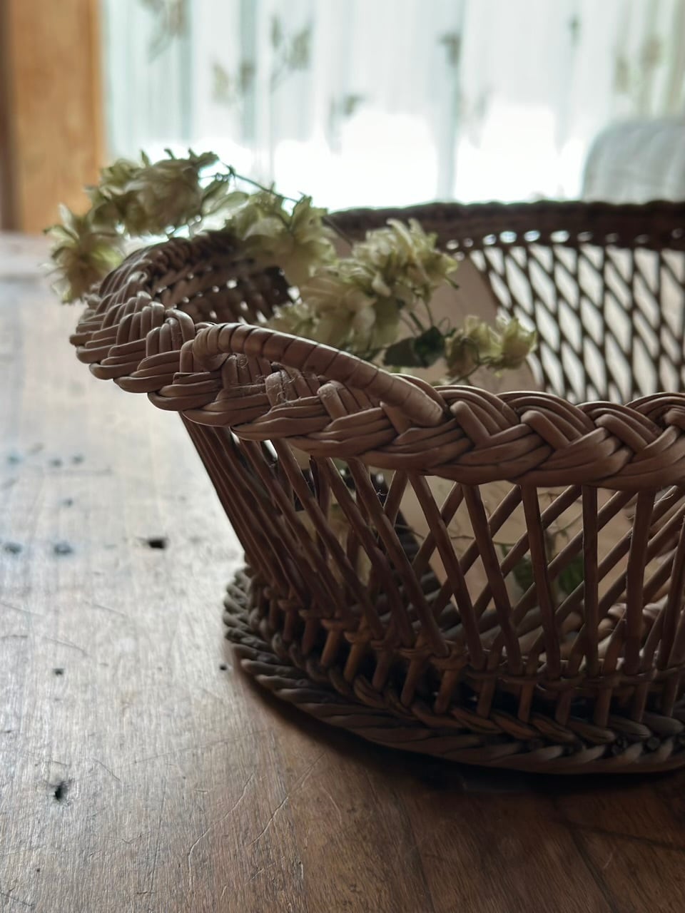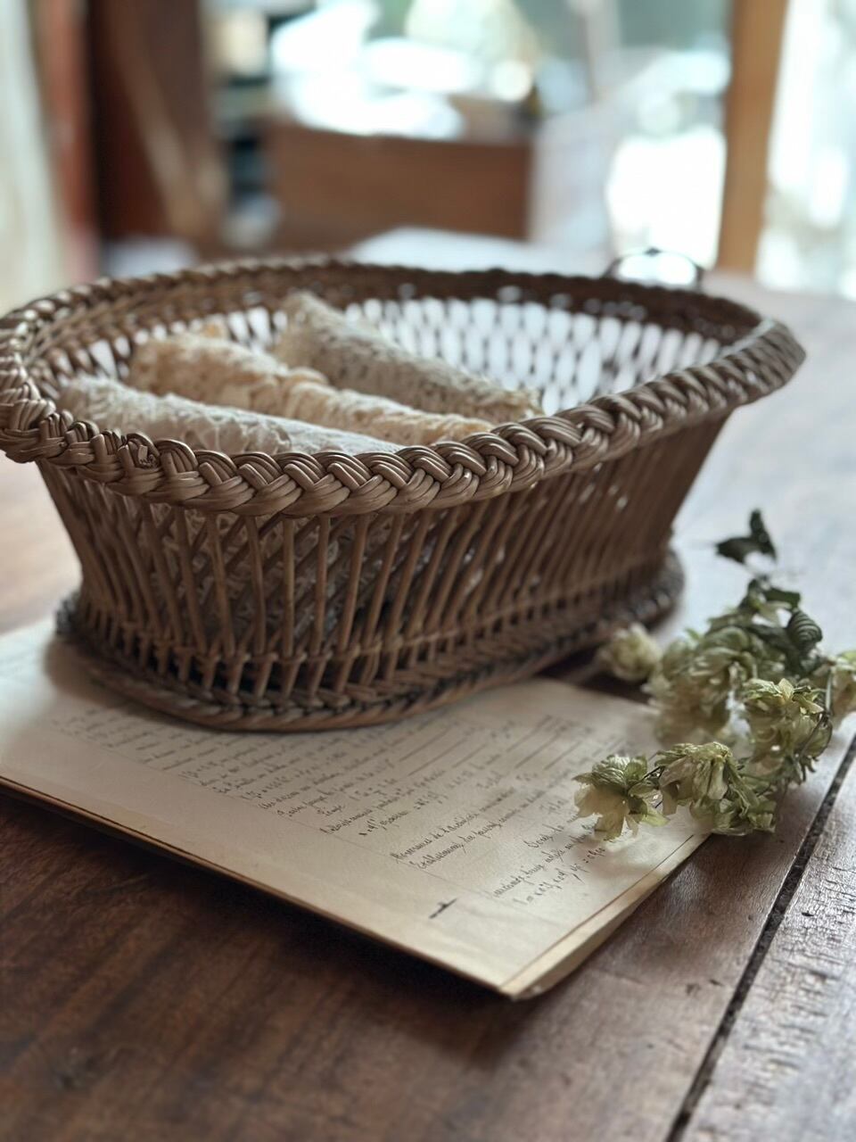 フランスの古い暮らしの中で大切に使われてきた、手編みのアンティーク・バスケットです。長い年月を経て、自然素材が深みのある美しい色へと育っており、置くだけでその場の空気をしっとりと落ち着かせてくれるような佇まいをしています。