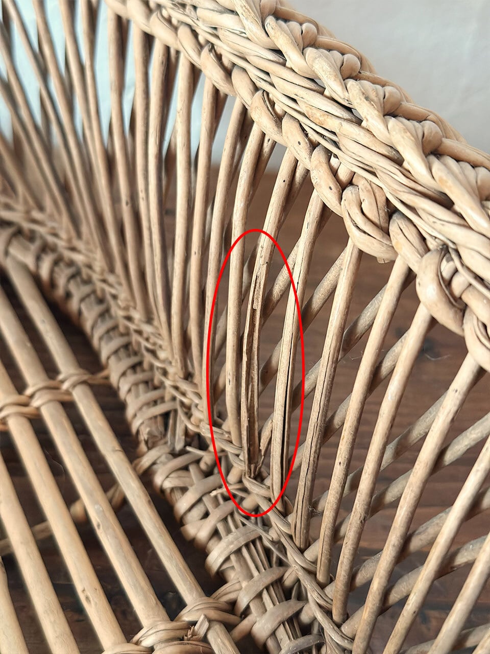 職人の指先から生み出された繊細な網目と、縁を彩る立体的な装飾編みが優雅な印象。底部はしっかりと組まれており、当時の手仕事の丁寧さが伺えます。