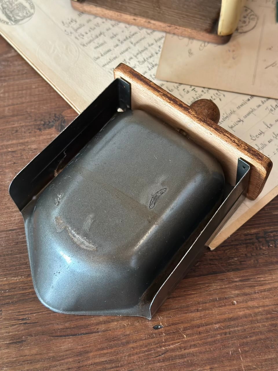 スチール製のボディを縁取るのは、使い込まれた味わい深い木製のトップと引き出し。