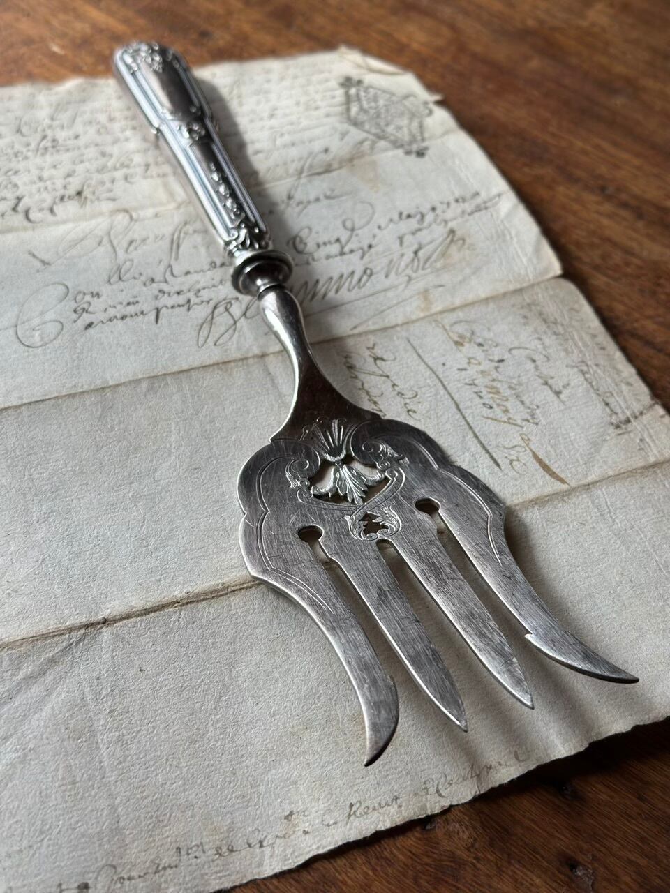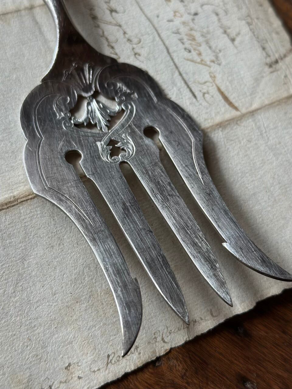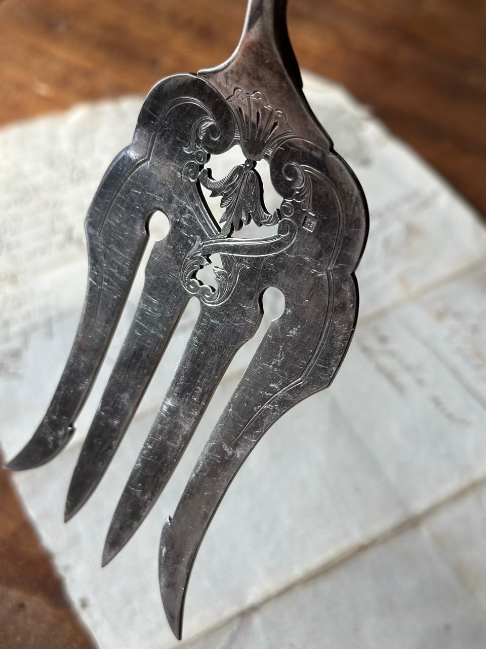 これほどまでに幅広く、芸術的な抜き細工が施されたフォークは、主に魚料理の取り分け、あるいは焼き菓子をサーブするために用いられました。