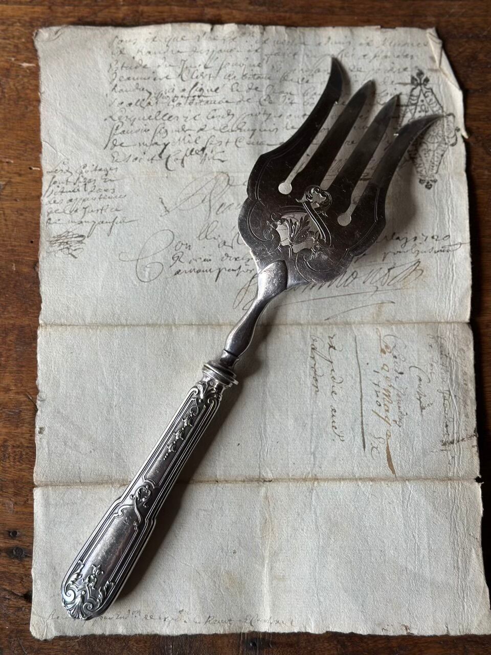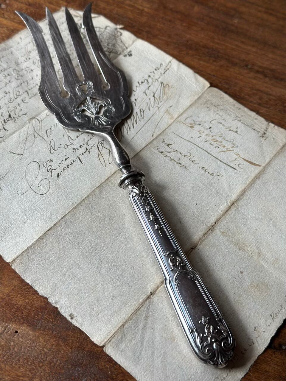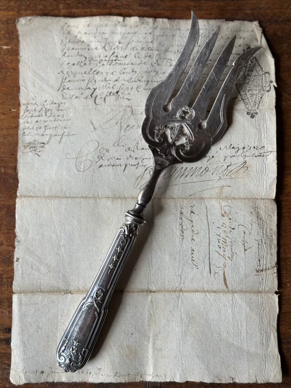 これほどまでに幅広く、芸術的な抜き細工が施されたフォークは、主に魚料理の取り分け、あるいは焼き菓子をサーブするために用いられました。