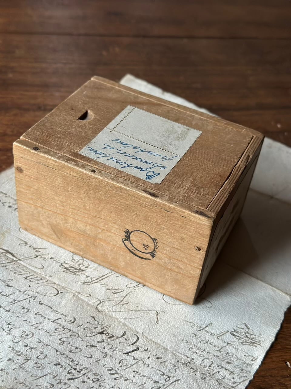 この木箱のユニークな点は、切手が貼られている面が裏面(底面)であること。 当時の郵送システムでは、宛名ラベルを大きく見せるために、切手や消印はあえて底に配されることがありました。裏返した瞬間に現れる古い切手の佇まいに、当時の合理性と旅の足跡を感じます。