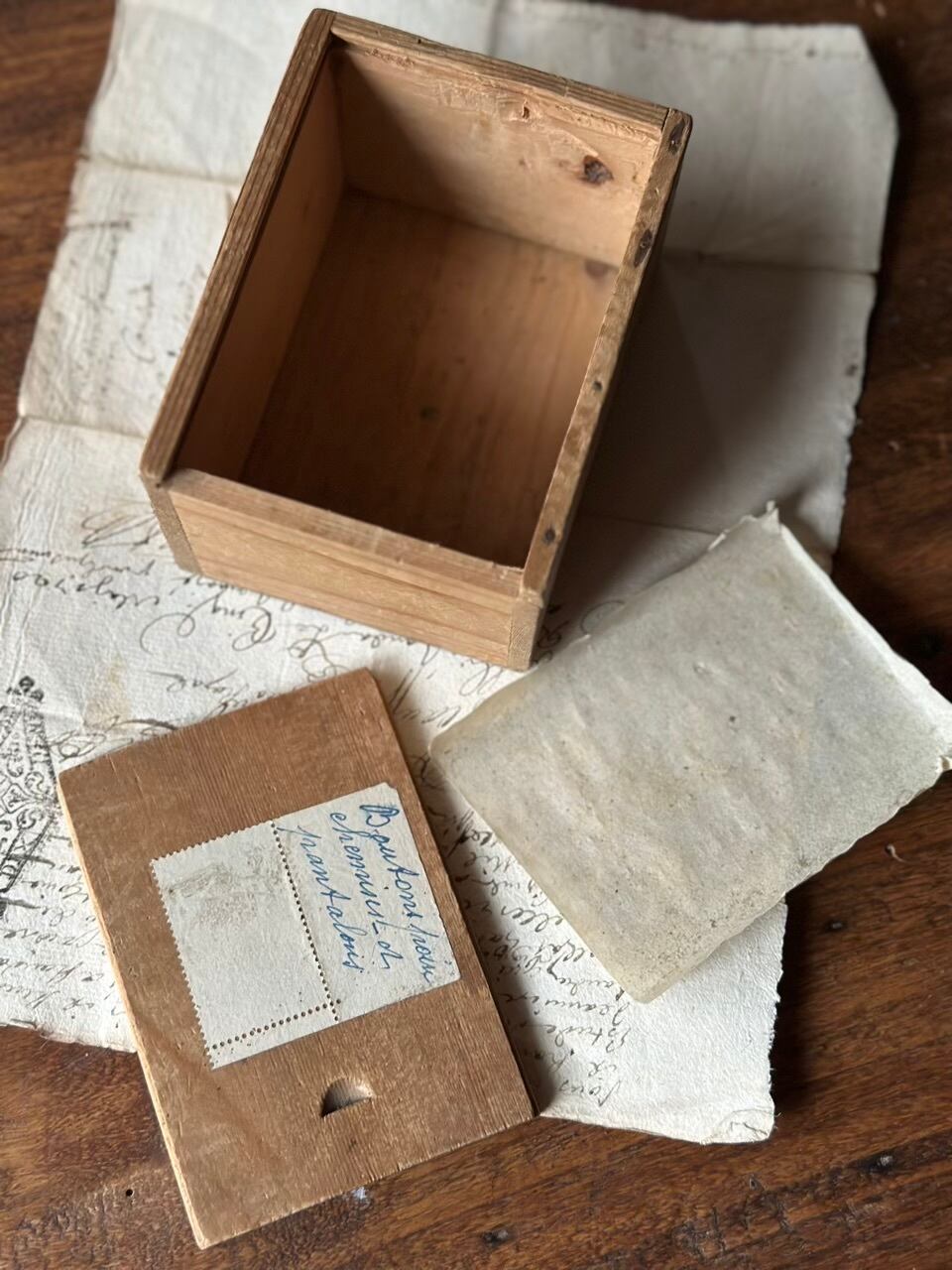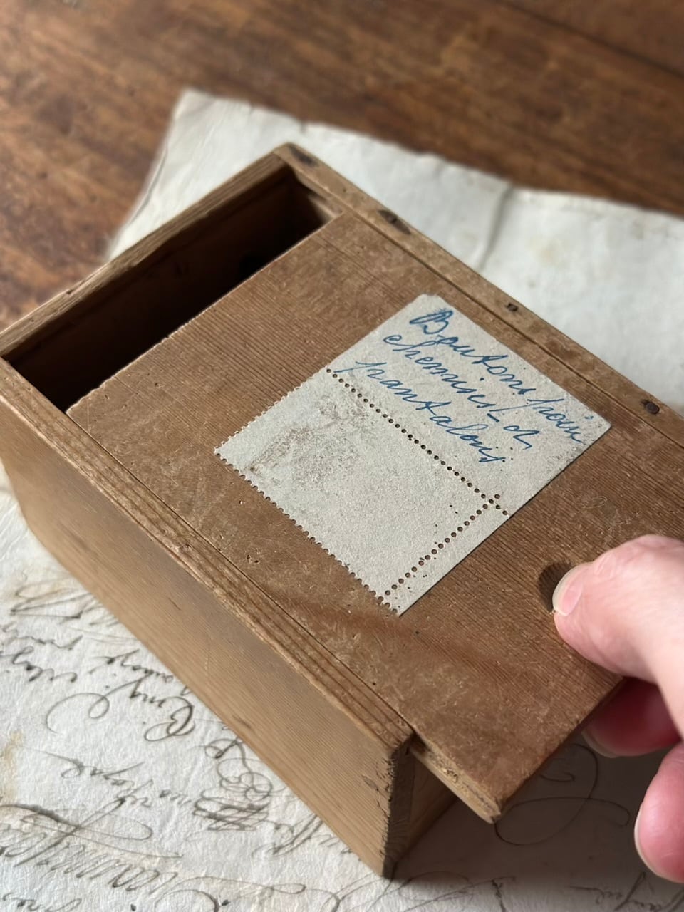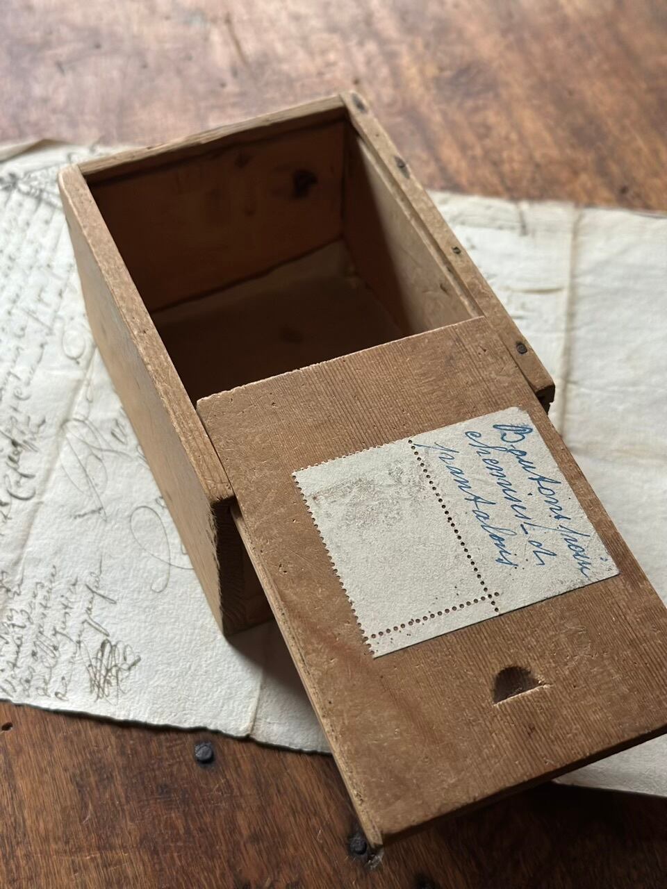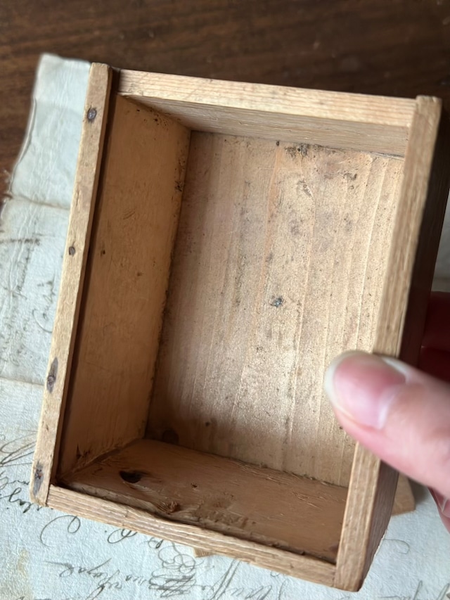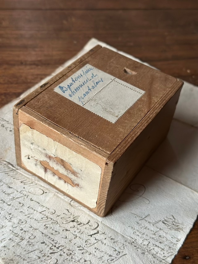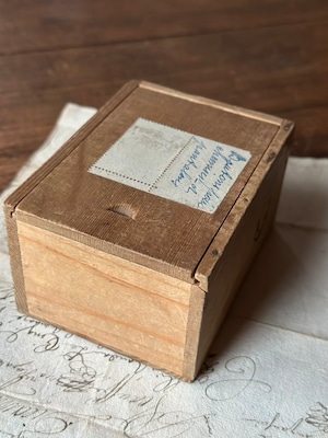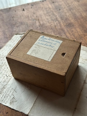 長い年月を経て深みを増した木肌、掠れたインク、そして大切に保管されていたことを物語るスライド蓋の滑らかさ。アンティークにしか出せない「静かな存在感」が漂います。