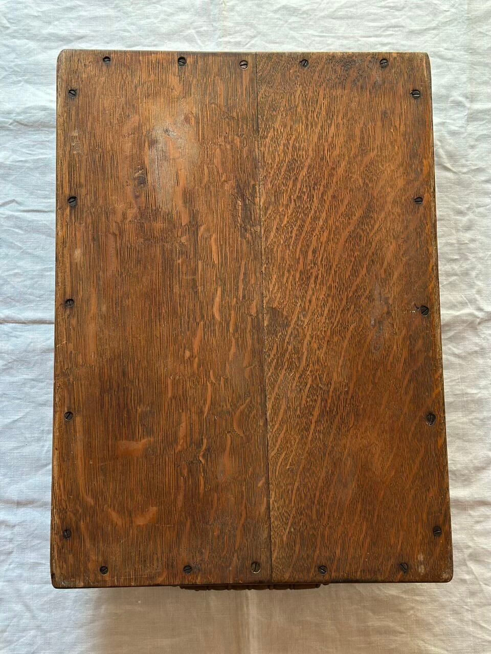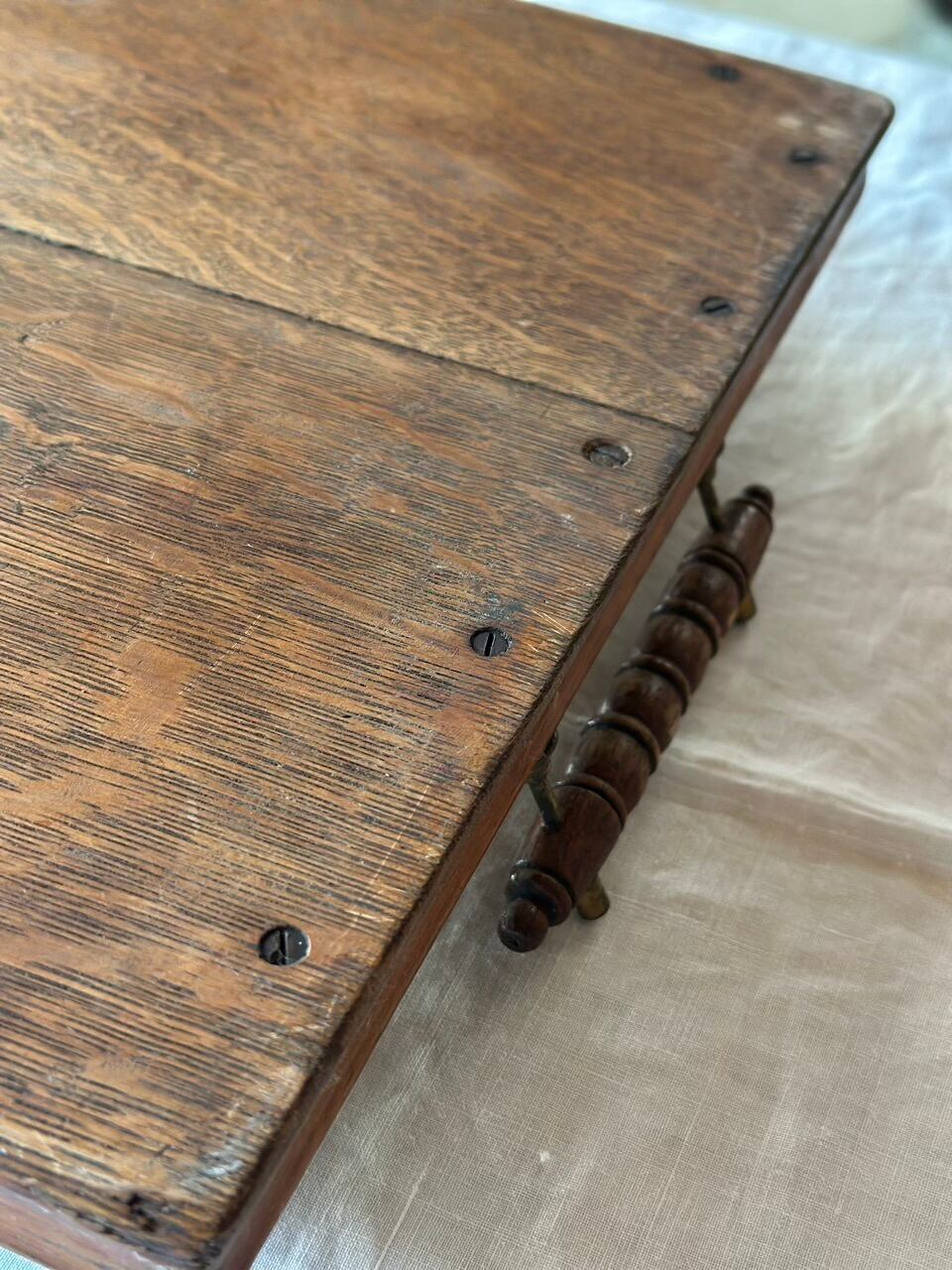 天板には、繊細な虎斑のような木目が見て取れます。表面の小さな傷や色の揺らぎは、代々の家庭で愛されてきた証。現行品には決して出せない、アンティークだけが持つ優しくも重厚な存在感です。