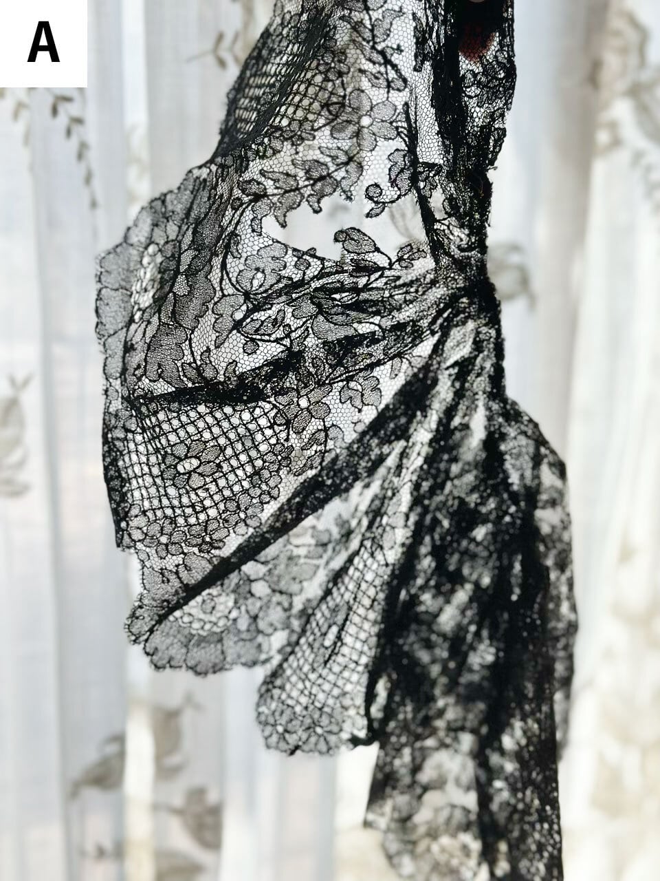 繊細なネット地に浮かび上がる、影絵のような花々と幾何学模様。光に透かすと、まるで古いモノクロ映画のワンシーンを切り取ったかのような、静謐な輝きを放ちます。