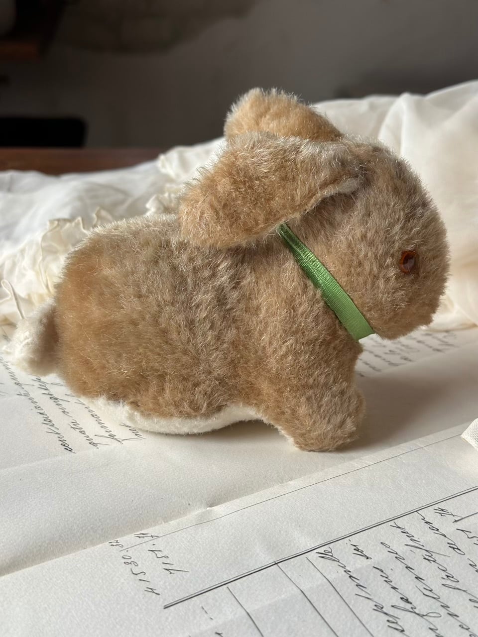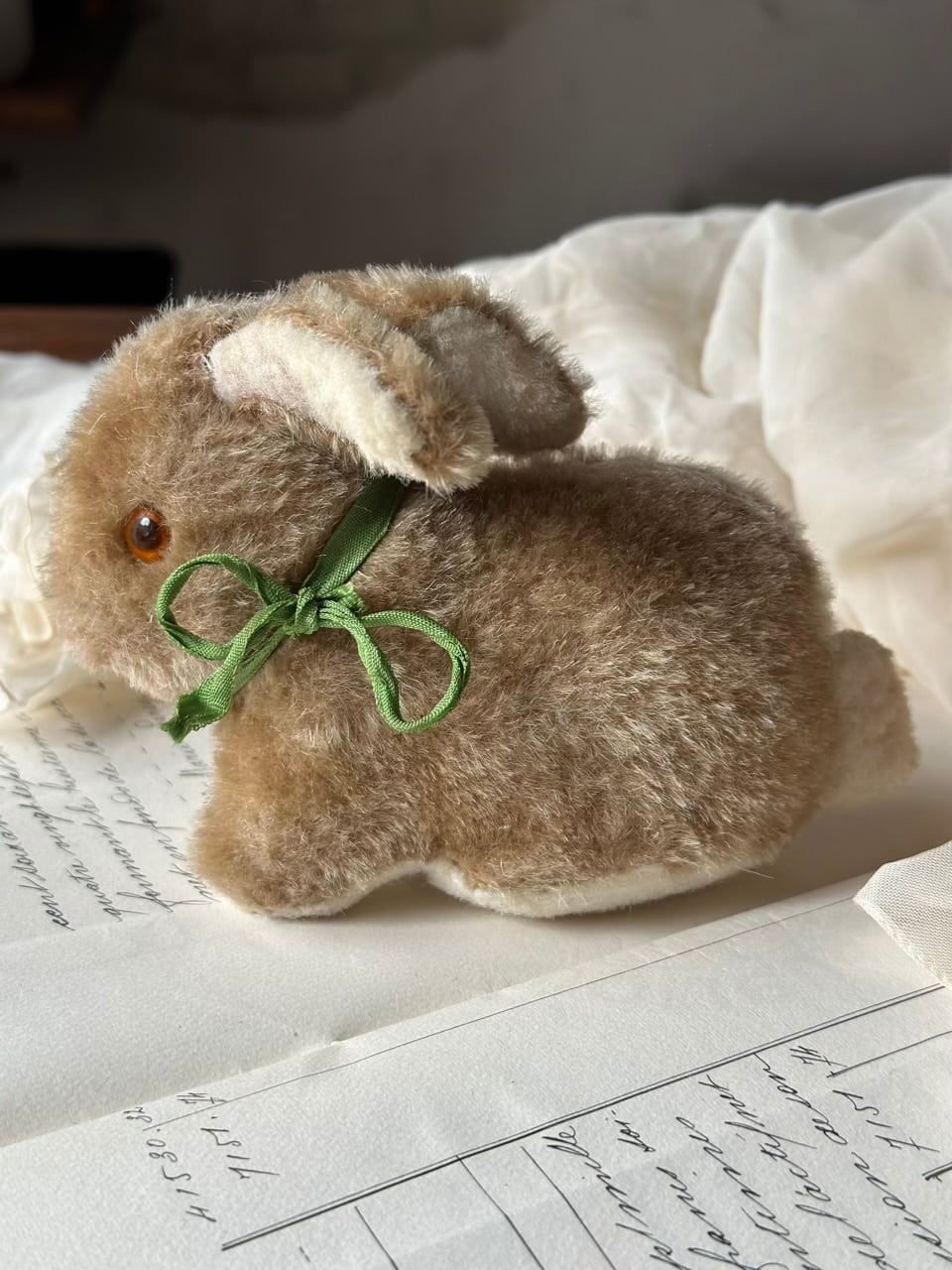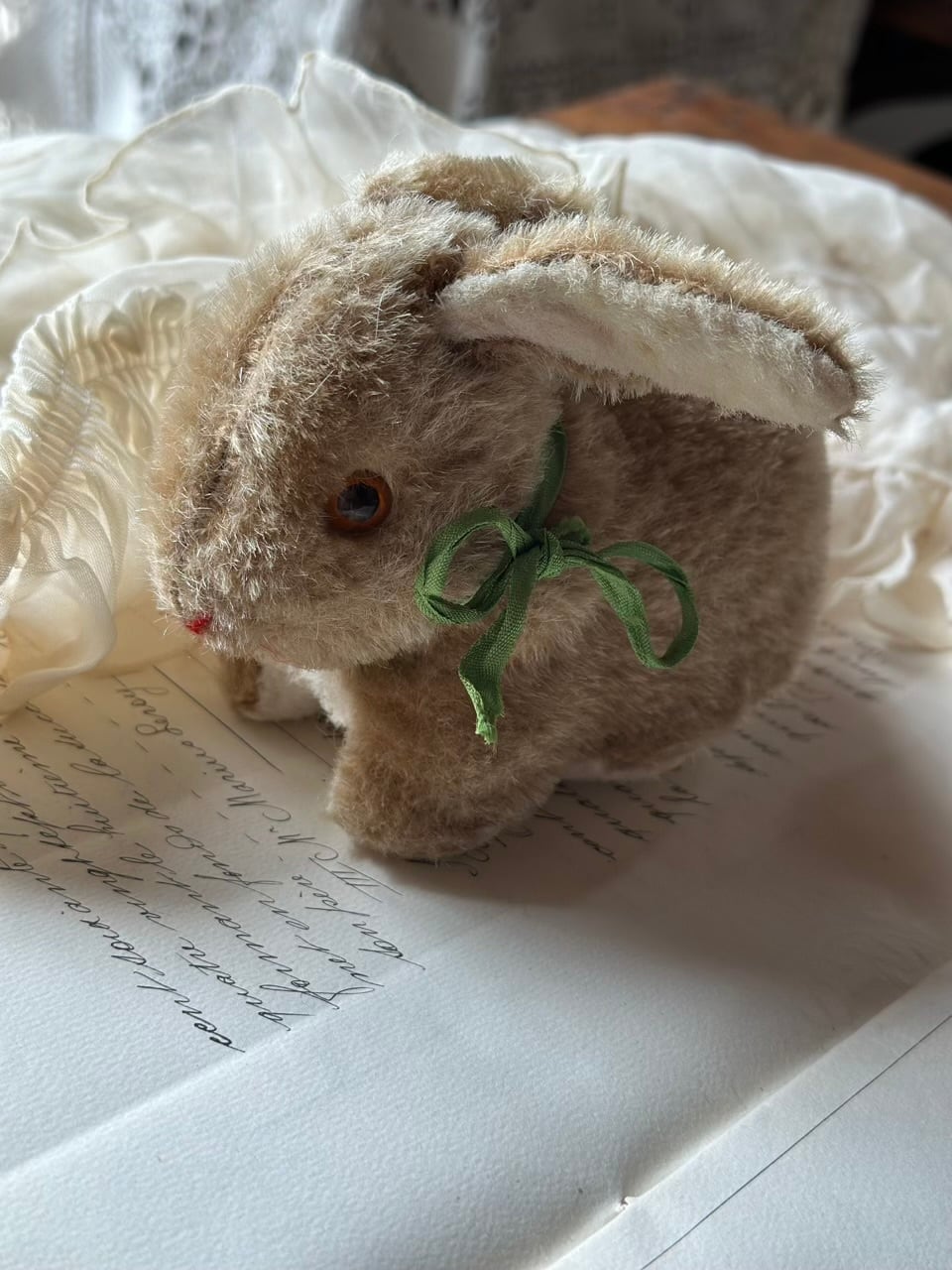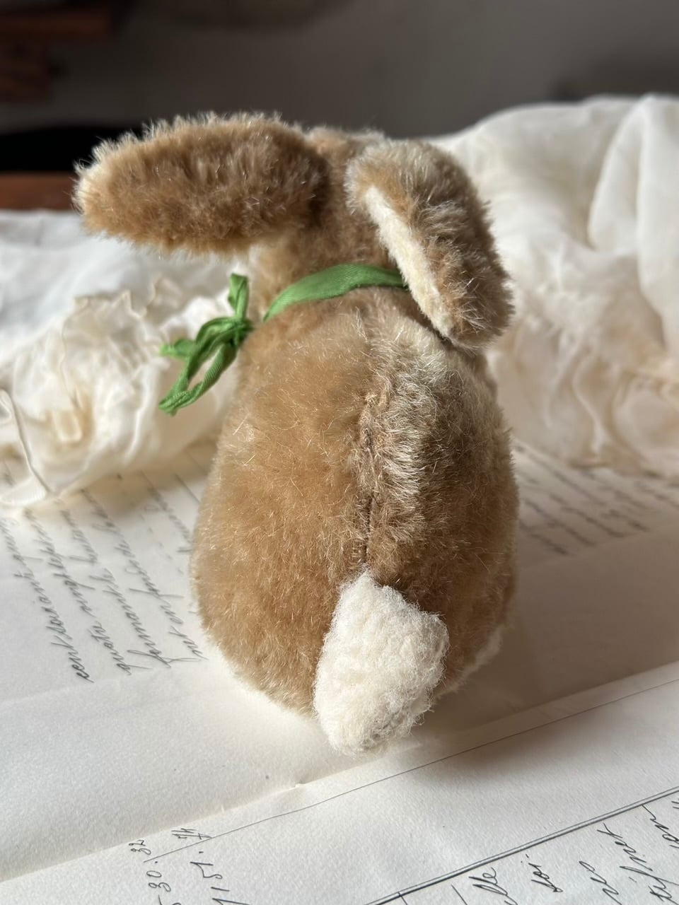 淡いブラウンの柔らかな毛並みに、ちょこんと結ばれたグリーンのリボン。
