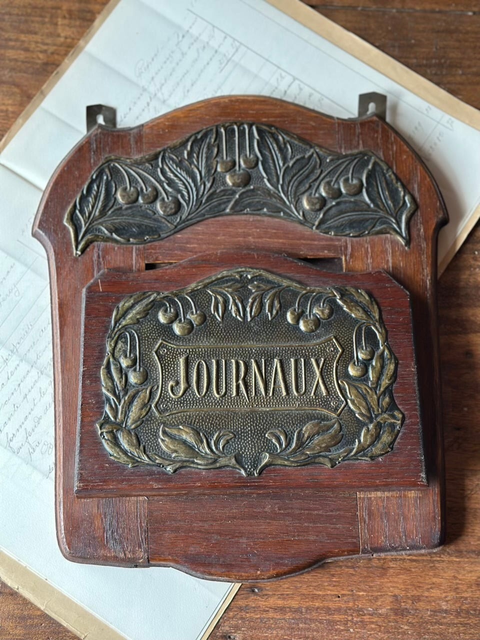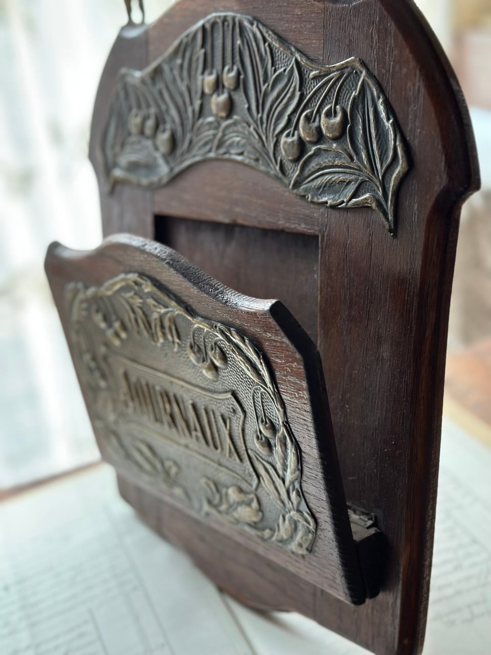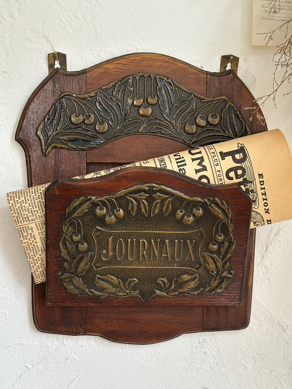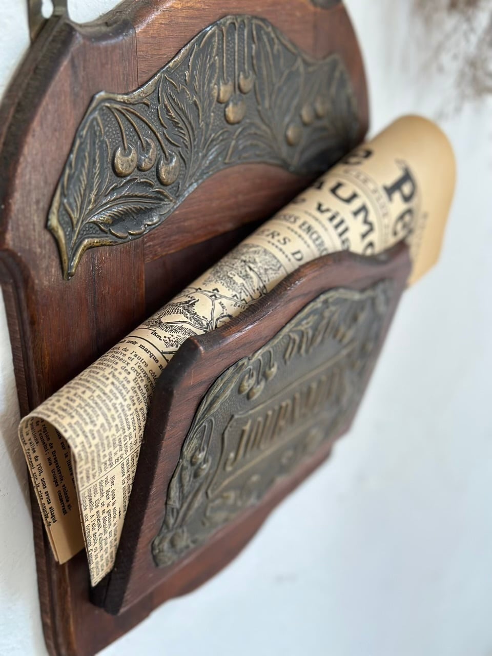 中央に刻まれた「JOURNAUX」はフランス語で新聞を意味します。当時は新聞が情報の主役であり、朝のひとときを終えた新聞を美しく、かつ実用的に整理するために、こうした専用のホルダーがブルジョワジーの家庭やカフェの壁を彩っていました。