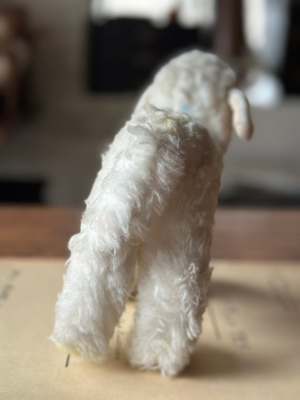 胸に付いているタグのデザインから、1960年代後半から1970年代にかけて製作されたものと推測されます。この時期のシュタイフは「Cosy(コージー)」シリーズを展開しており、それまでの硬い詰め物の観賞用ぬいぐるみとは異なり、お子様が抱きしめて遊べるような柔らかい質感を重視して作られていました。時を経てもその柔らかなふわふわとした触り心地は健在です。