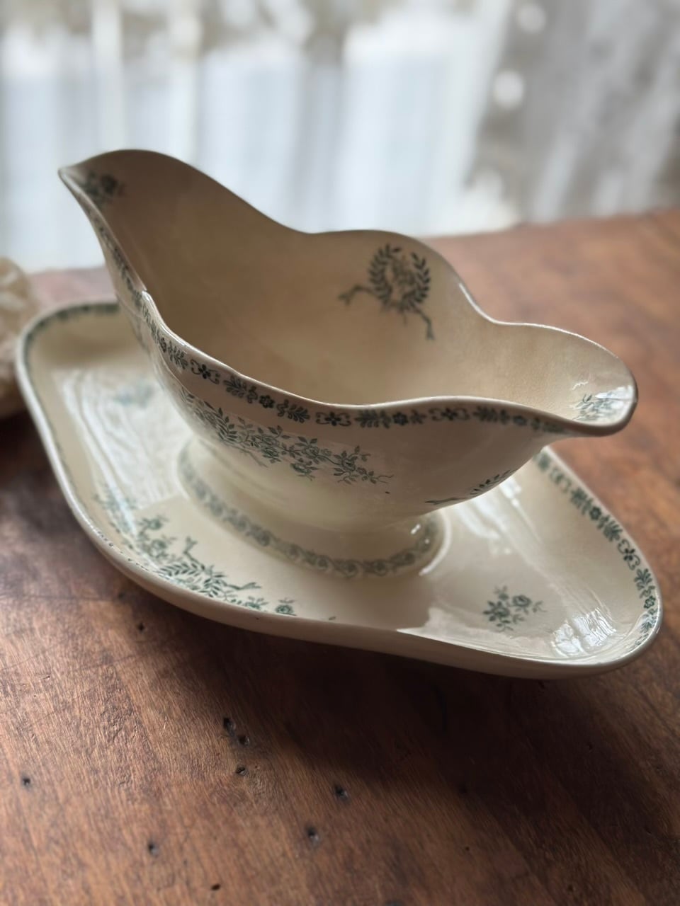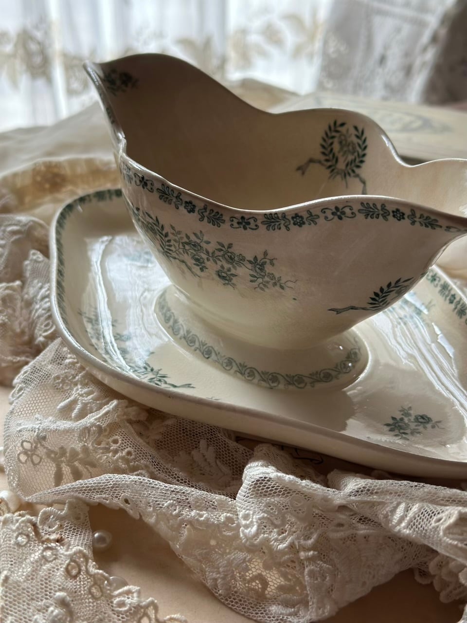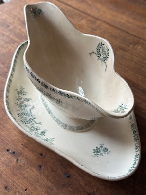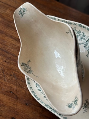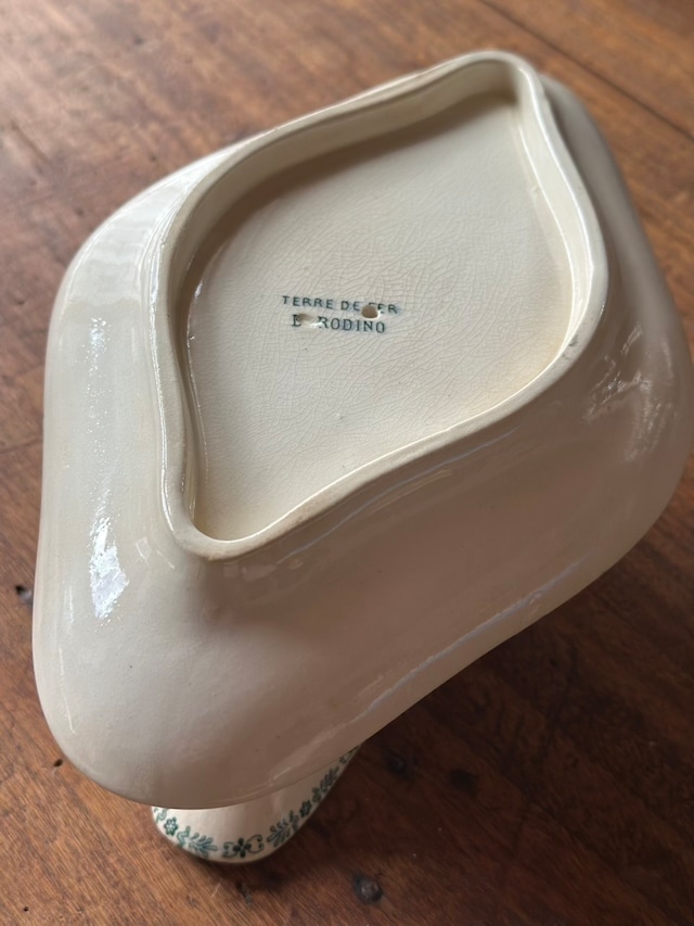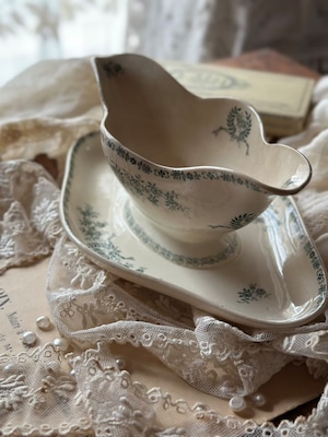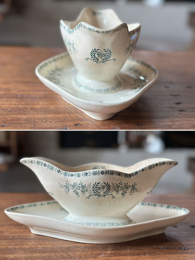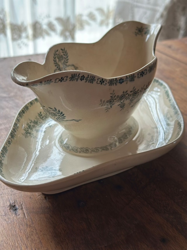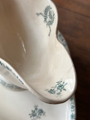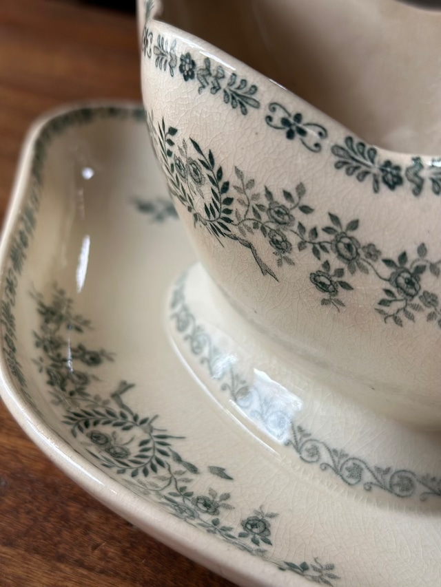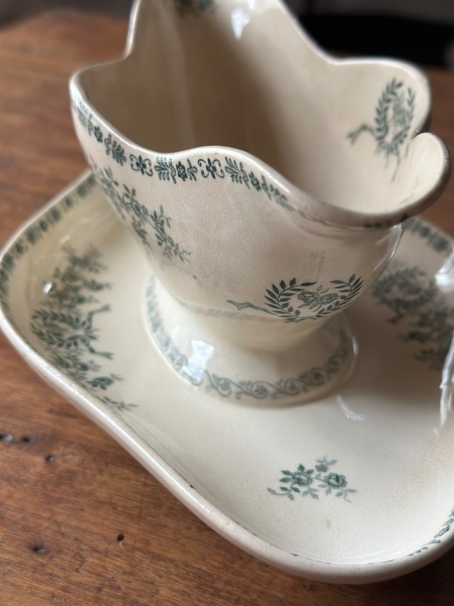 陶石を混ぜて高温で焼き上げられたTERRE DE FER(テール・ド・フェール)特有の、しっとりとした質感と程よい重み。そこにあしらわれた、深いグリーンの転写で描かれた可憐な草花が目を引くお品です。流れるような曲線美と、受け皿が一体となったクラシックなフォルムが、置くだけでその場に静かな気品を添えてくれます。