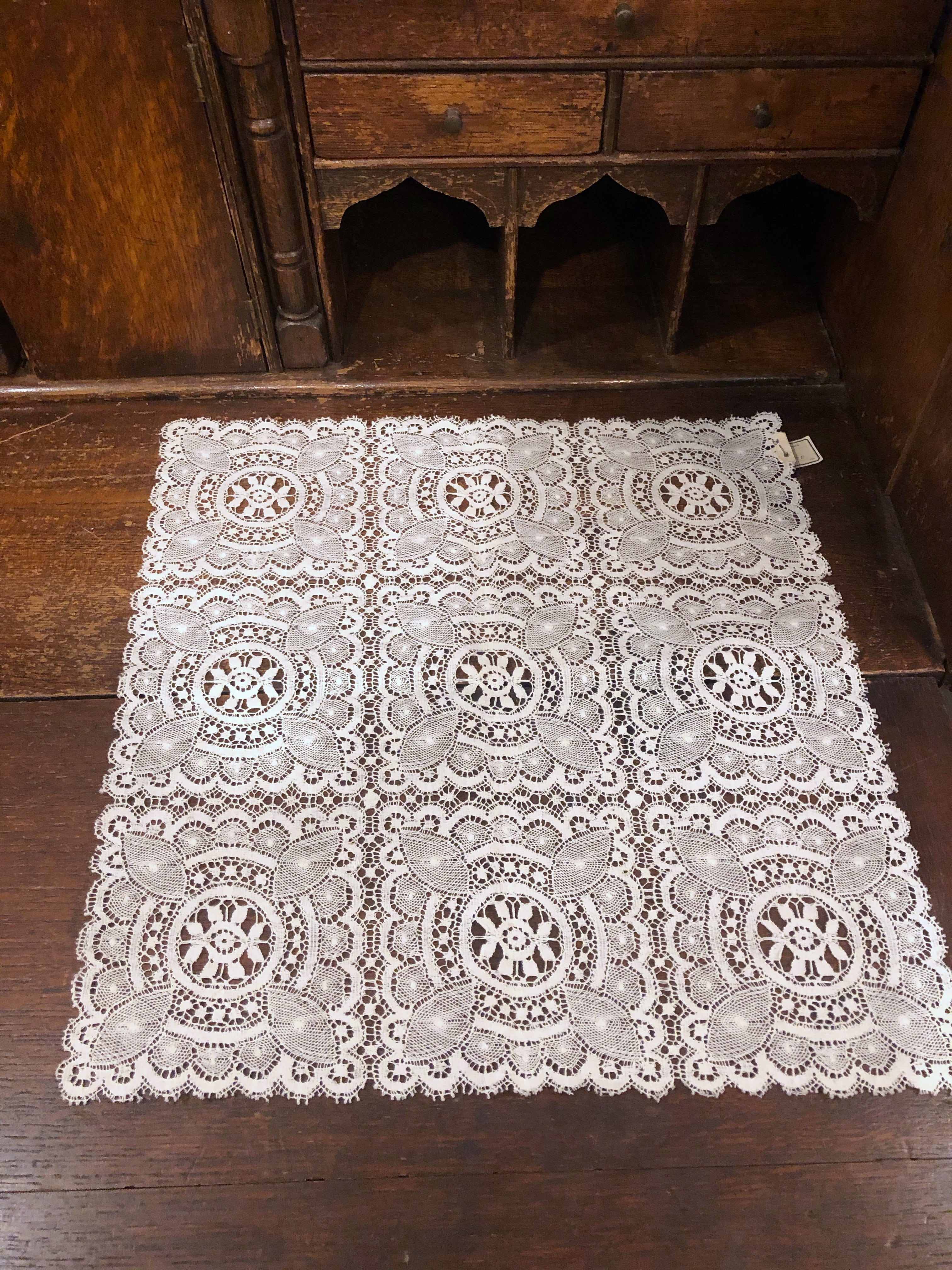 四角のモチーフを9枚組み合わせたような美しいレース。透け感もありドイリーとして使えそうです。