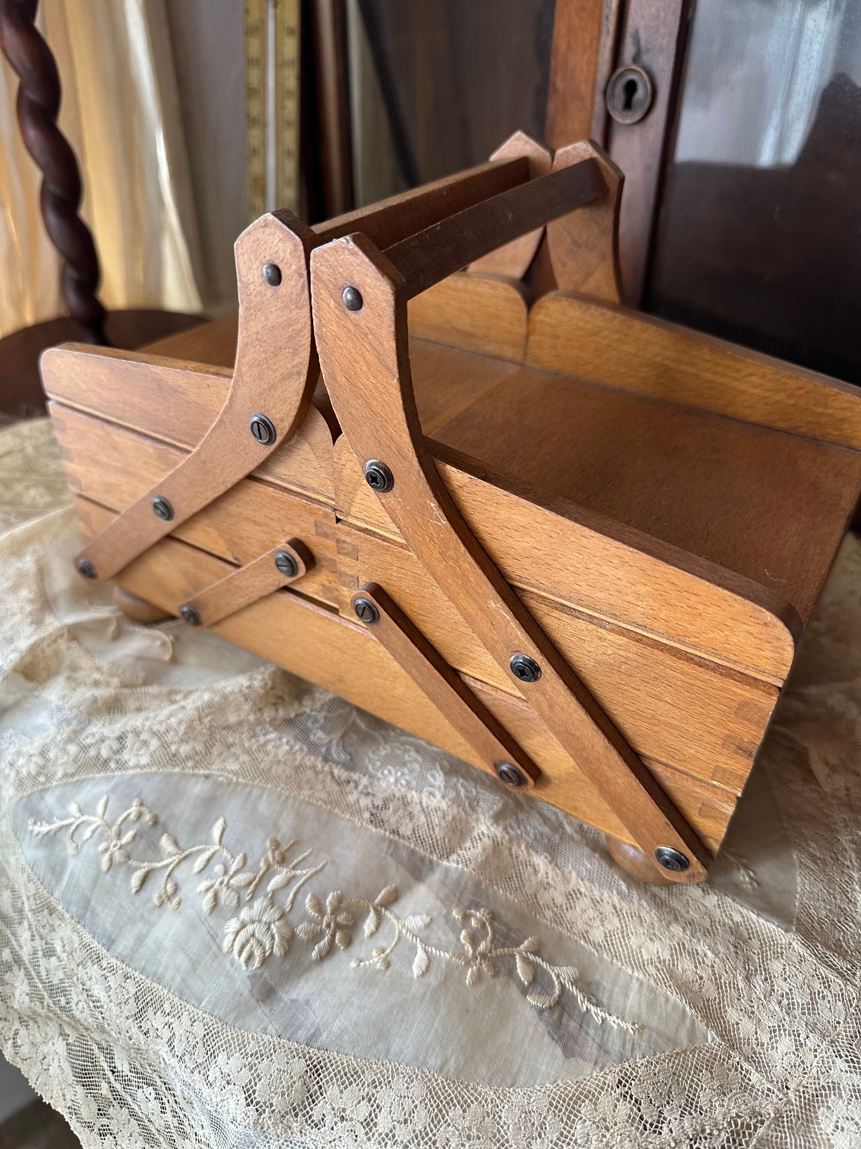 フランスより入荷しました、小ぶりなサイズのソーイングボックス 裁縫箱です。2段式で持ち手を横に広げると、棚が開く仕組みです。
