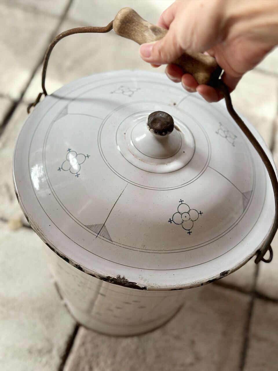 フランスより入荷しました、白いエナメル肌に濃いブルーの模様が爽やかで可愛らしい蓋付きバケツです。
