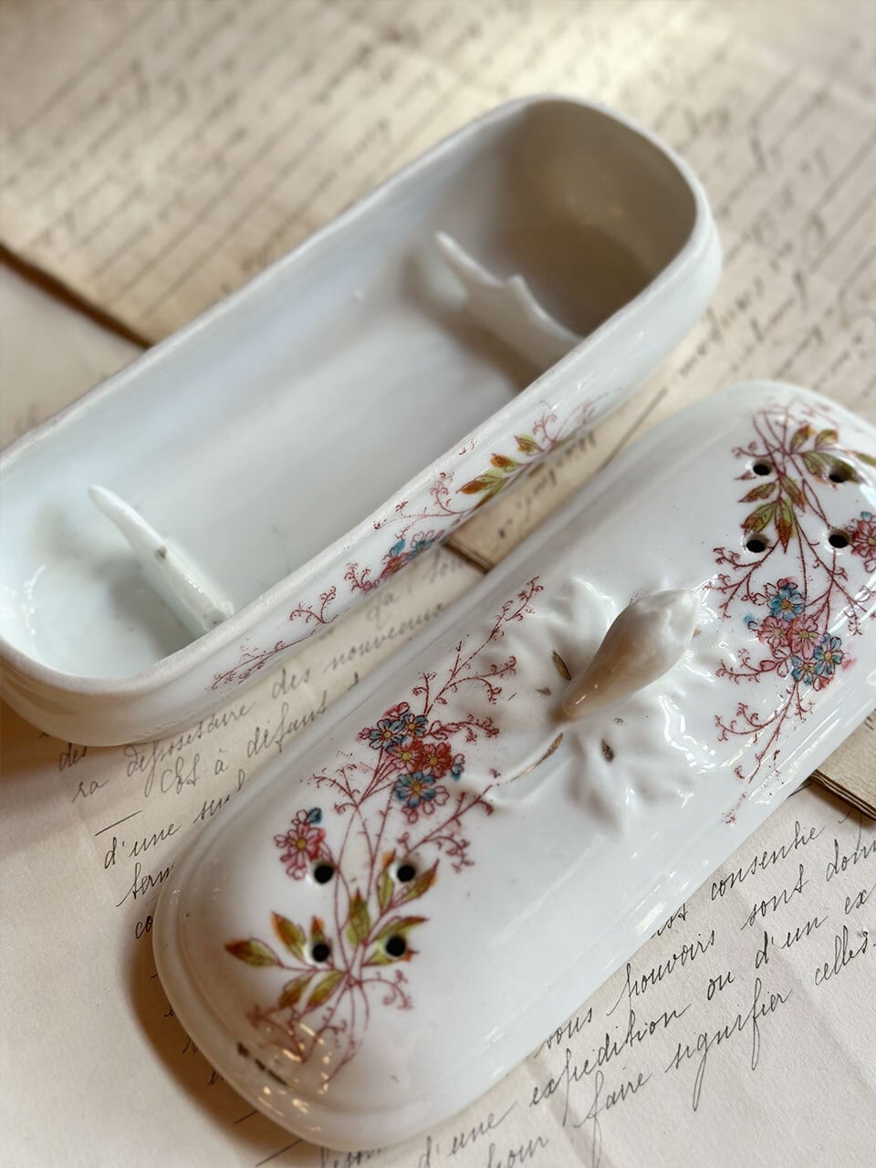 繊細な草花が描かれた、大変フェミニンなお品。蓋の両側には4つずつ通気の穴が空いています。